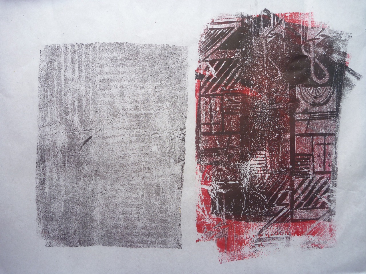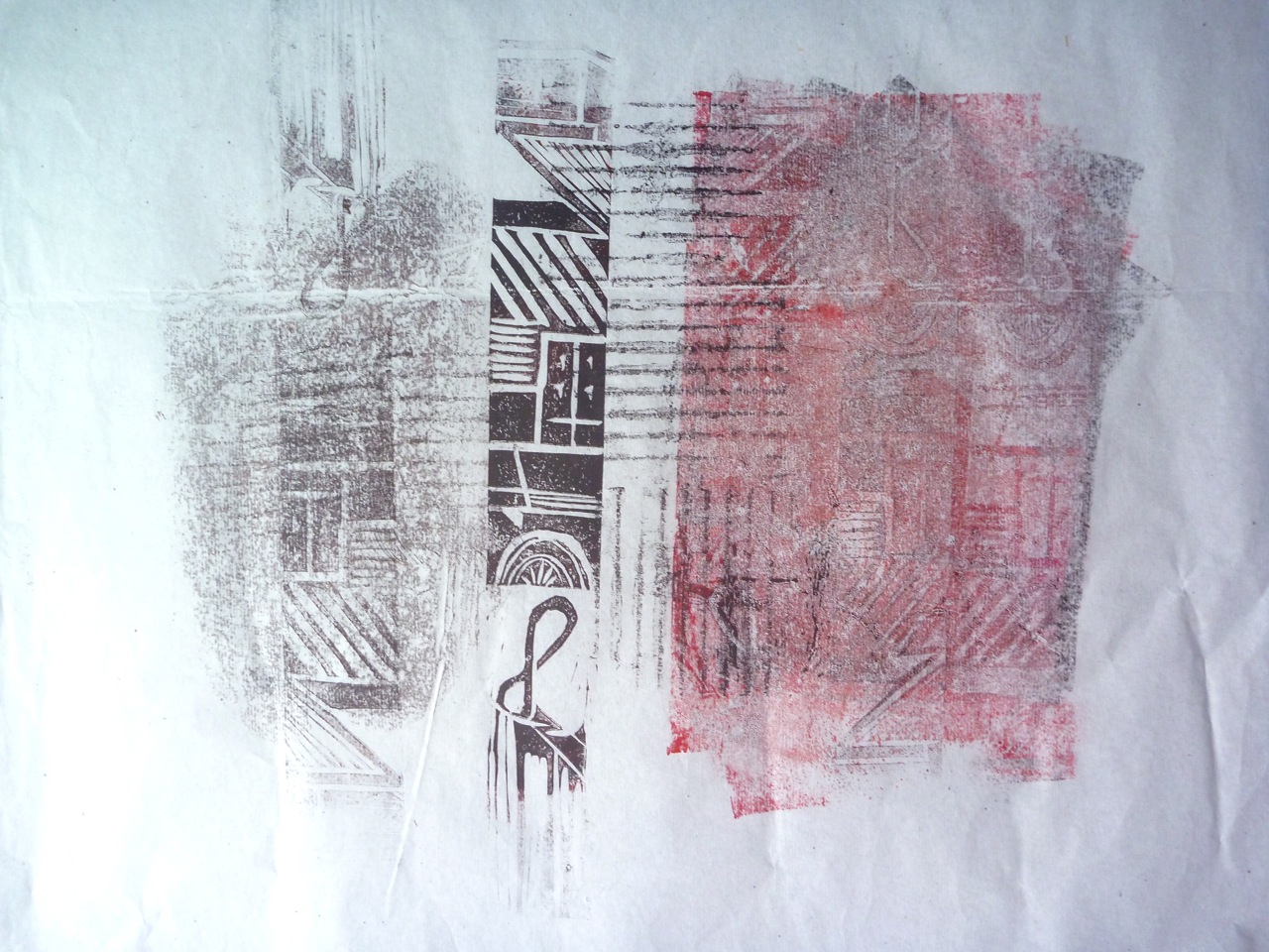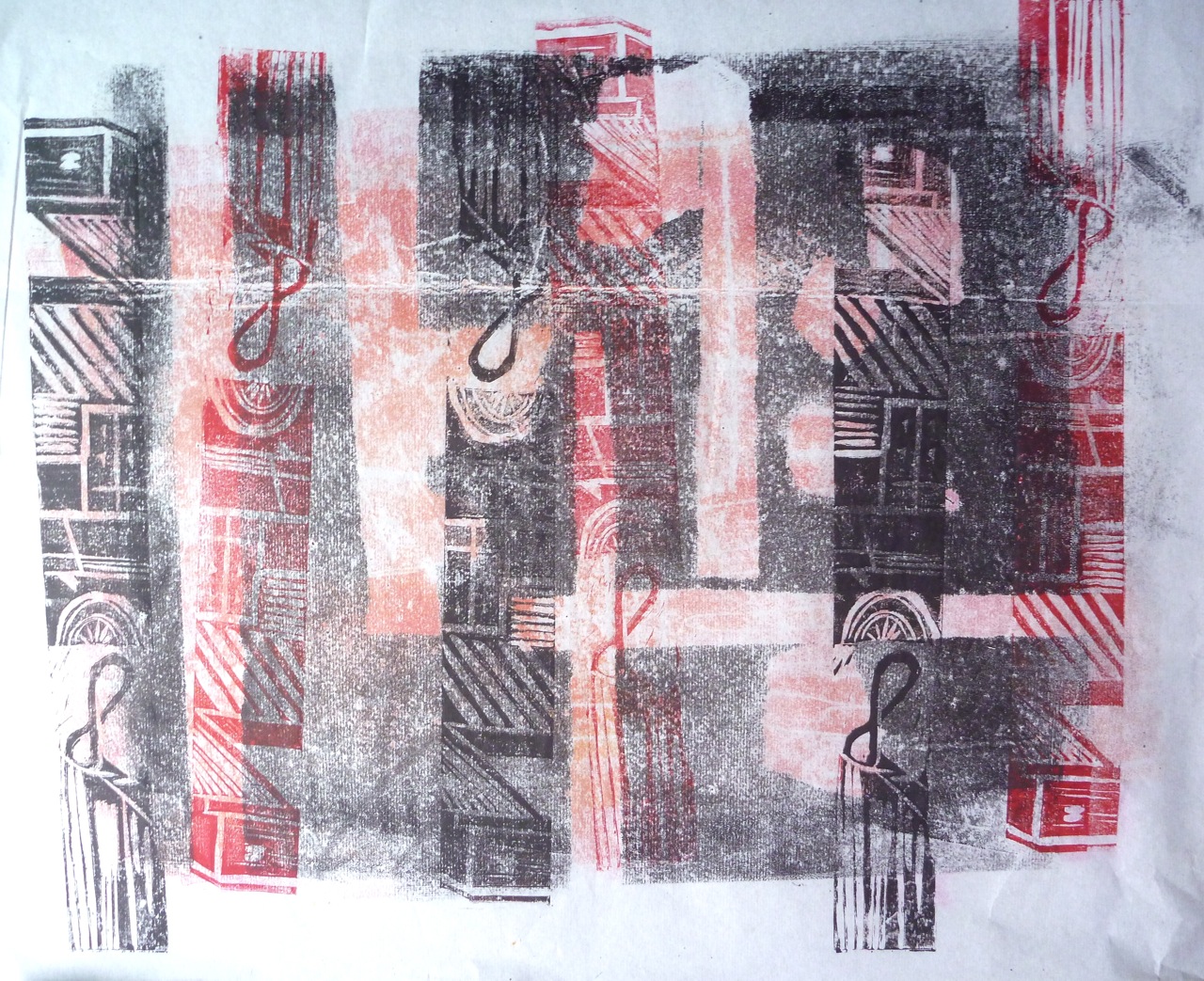 In fact I decided to use relief printing here as well as monoprinting, quite simply lino cut into strips with carvings on them to create a higgledy piggledy grid. The other technique used here is printing on the back of the semi-transparent paper to get a lighter print. I kept to the colour scheme of the photo, using red and black ink, but because of using both sides of the paper, get grey and light red too.