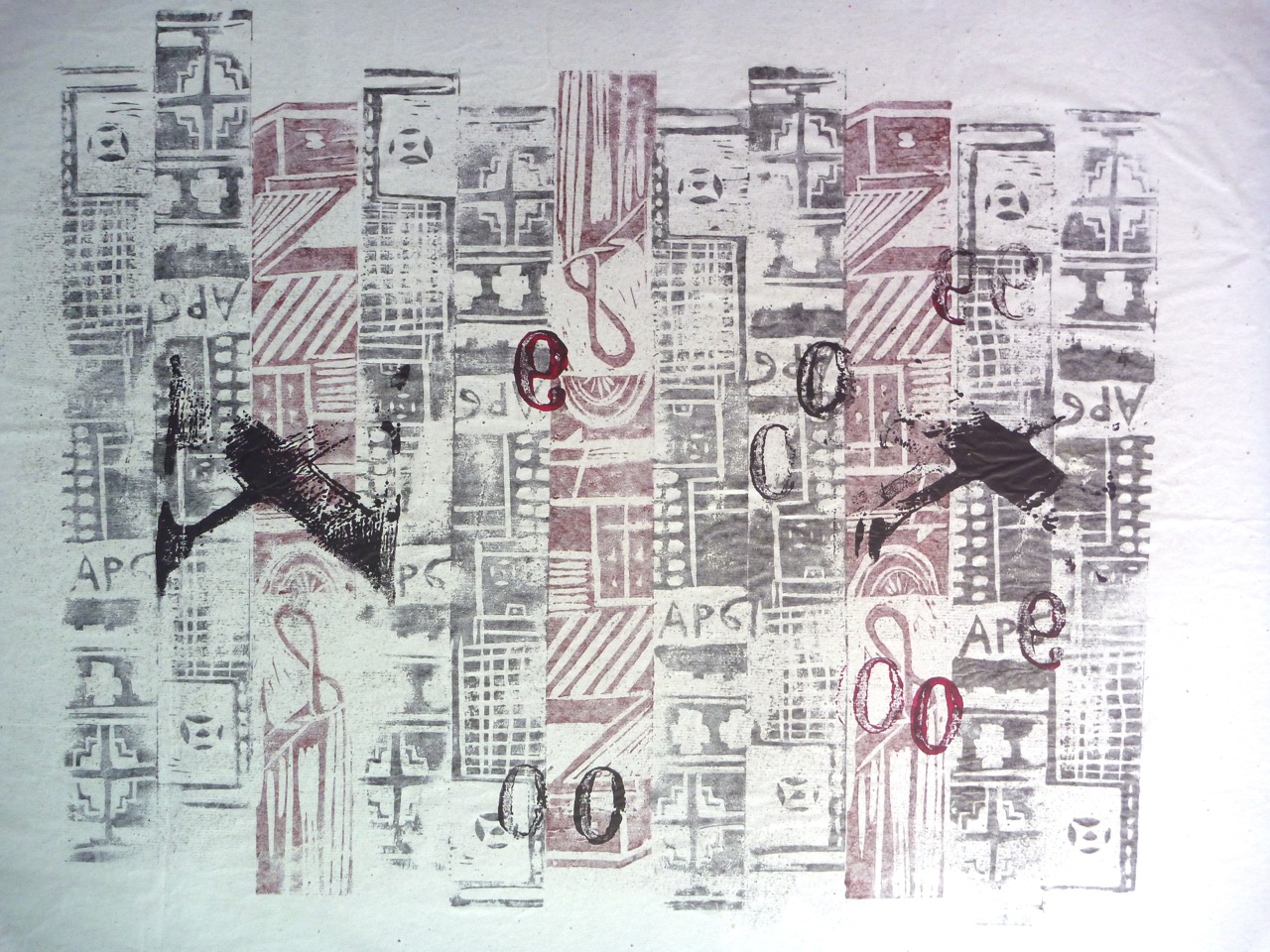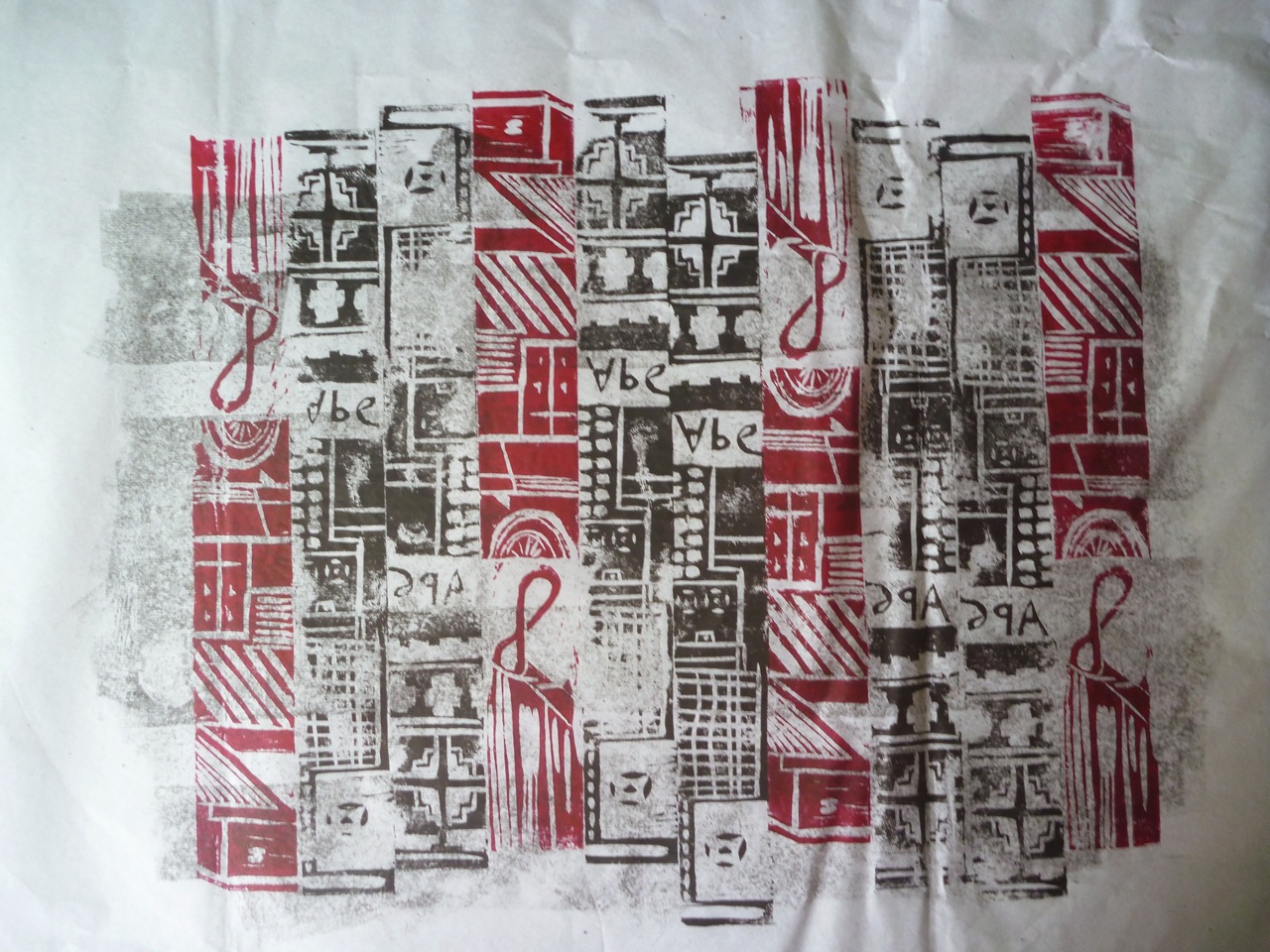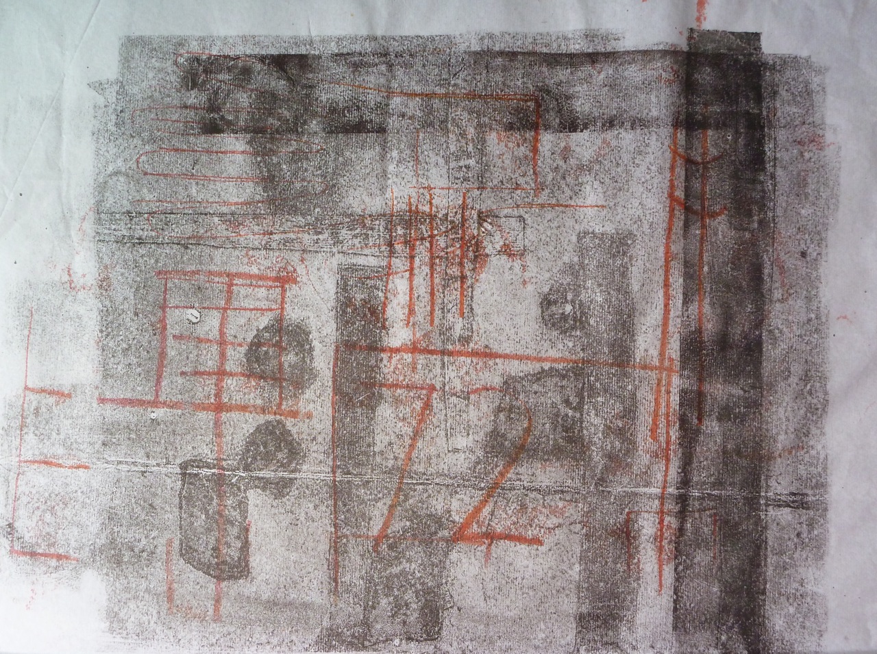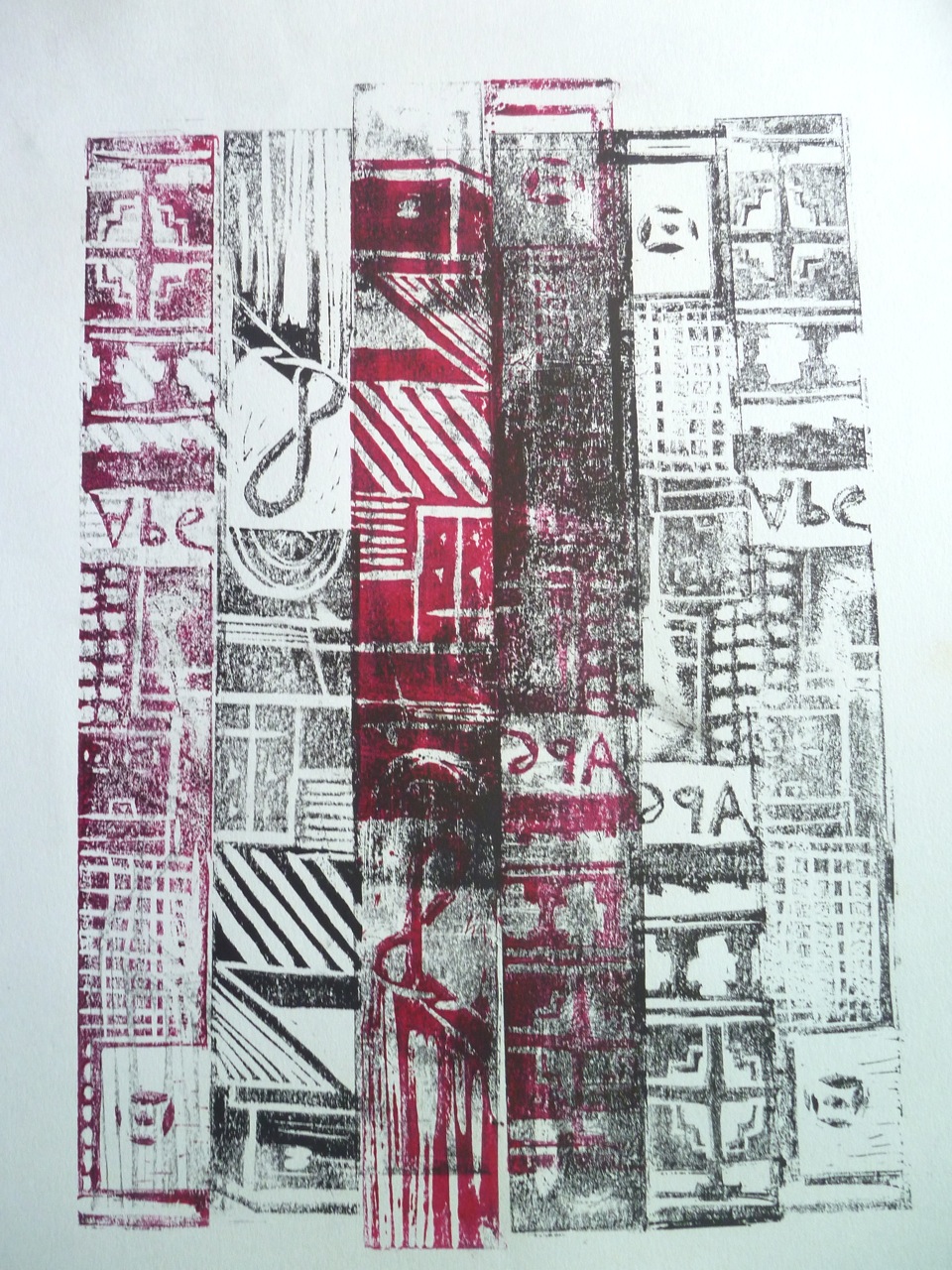 In fact I decided to use relief printing here as well as monoprinting, quite simply lino cut into strips with carvings on them to create a higgledy piggledy grid. The other technique used here is printing on the back of the semi-transparent paper to get a lighter print. I kept to the colour scheme of the photo, using red and black ink, but because of using both sides of the paper, get grey and light red too.