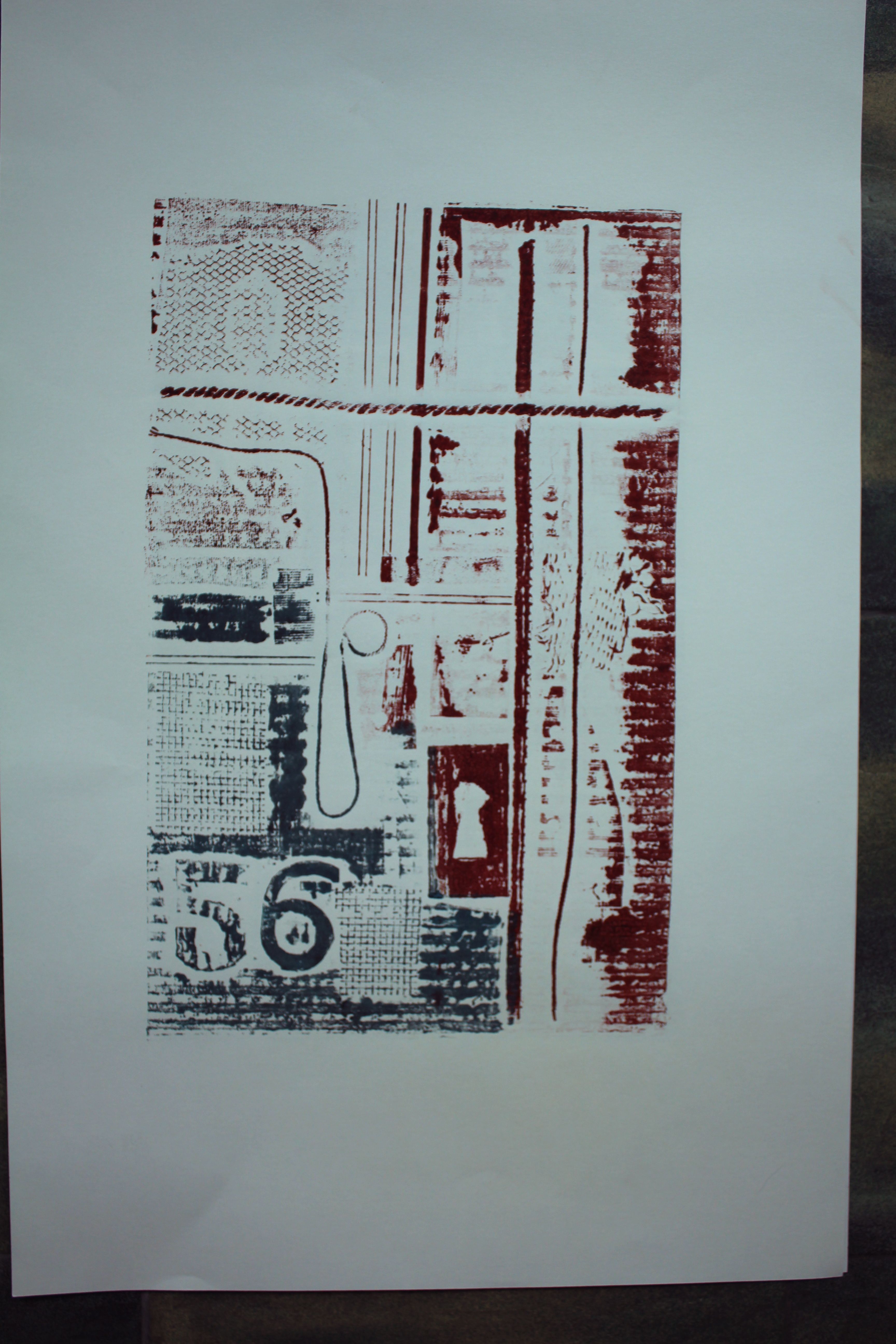I then made a collograph with corrugated card, plastic ties and mesh, and cut number shapes, keyholes, and stamped with cut-out wooden letters and numbers: