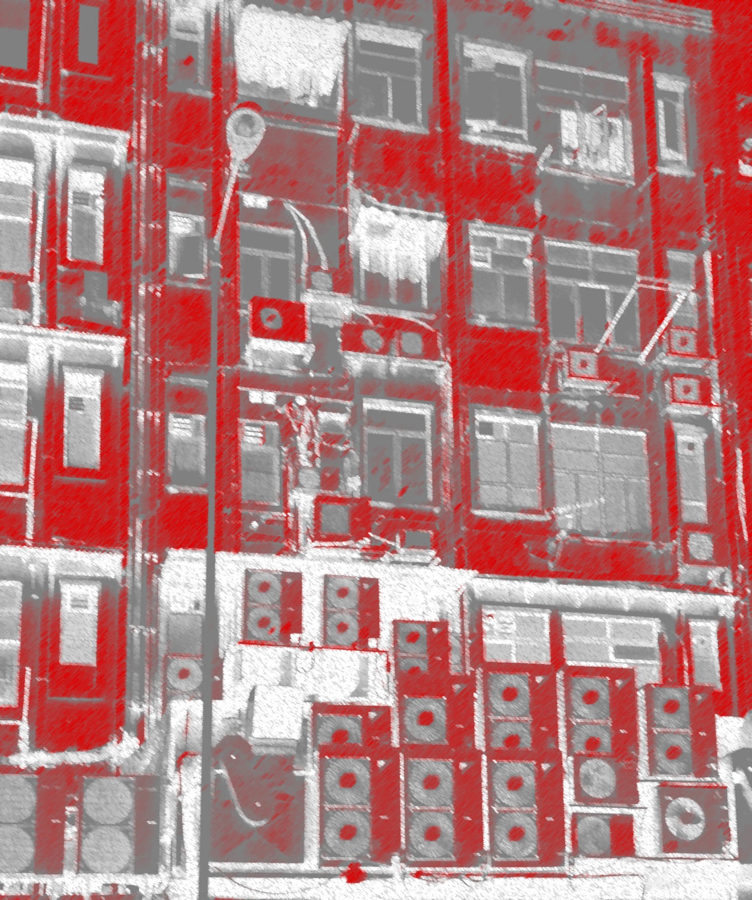 I then decided to cut strips of lino, making assorted marks on them (aircons, letter boxes, pipes, windows, door frames, door numbers) which could be arranged in different colours and densities, to suggest the erratic grids of the buildings. Some were cut with lino-cutting tools, some carved with scissors, scrubbed with sandpaper.