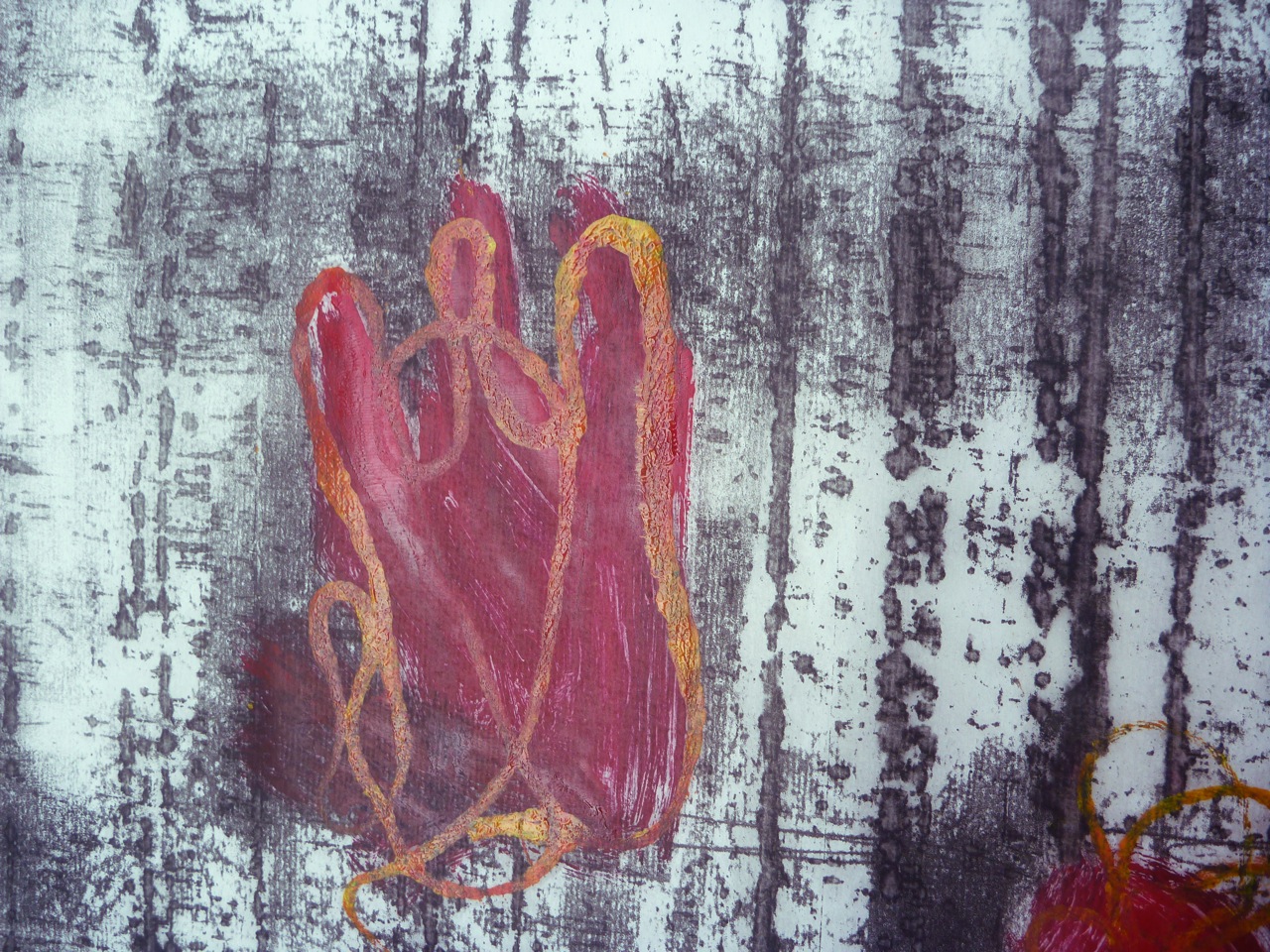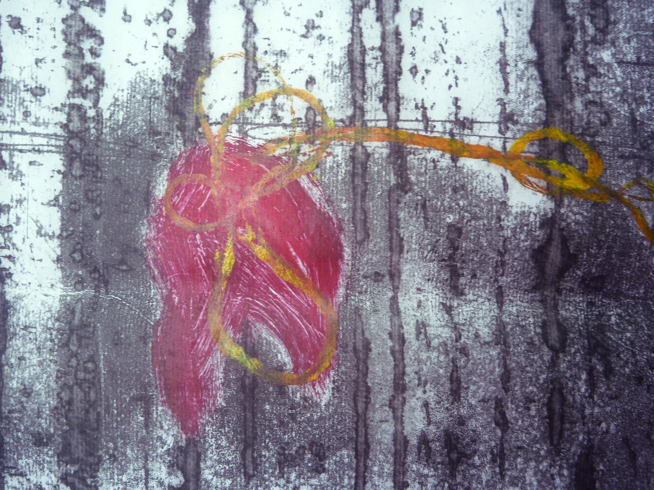 So, what I wanted to do was use the earlier techniques (1.1) of brushing and oil dipped string to create a bark-like texture, which would also echo the cement ridges left by construction. I was also keen on representing the fallen kapok flowers, which I did with inked thread and shapes painted into masked areas:
