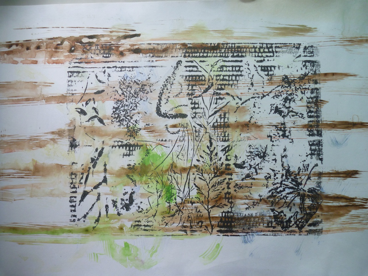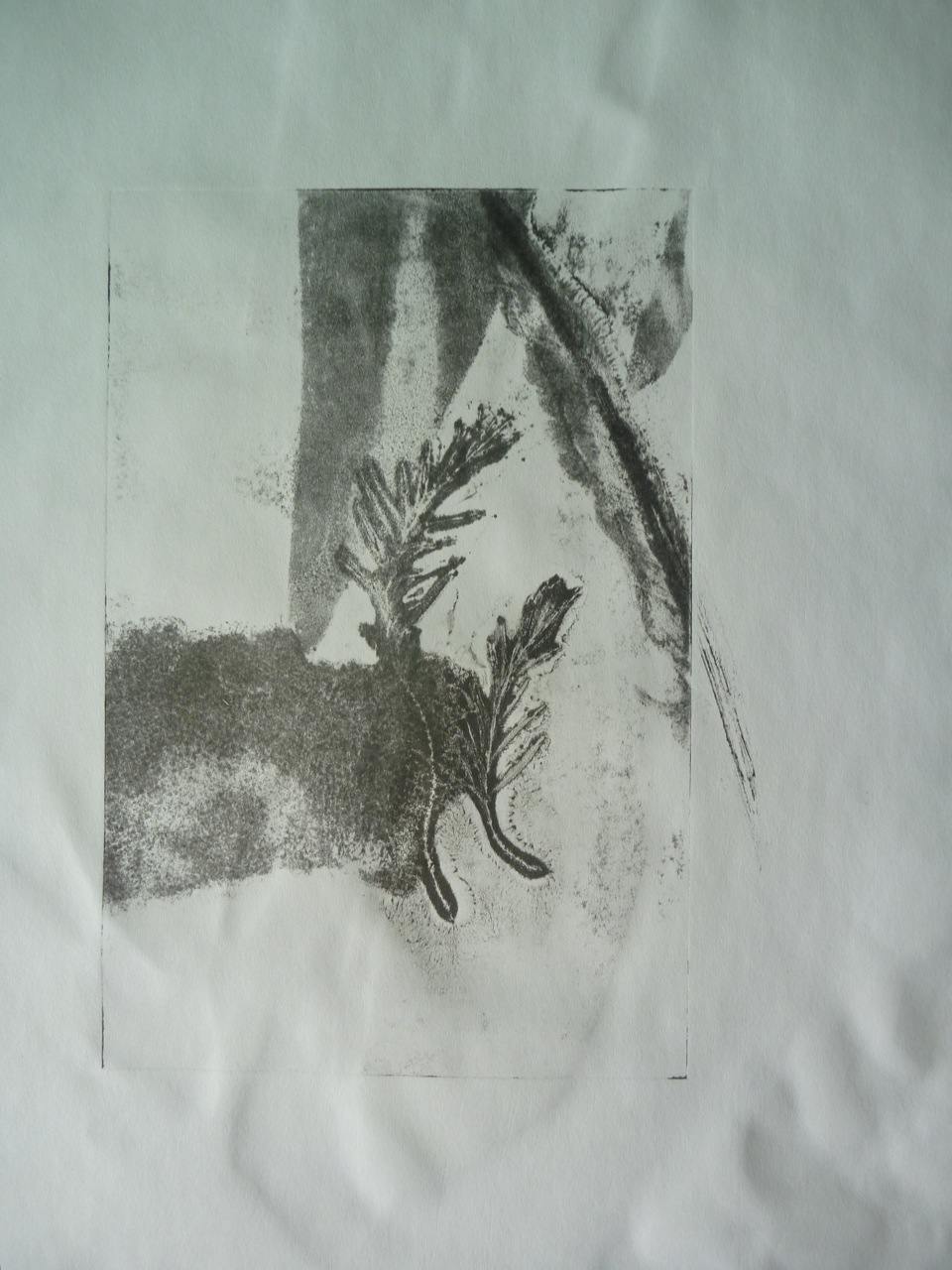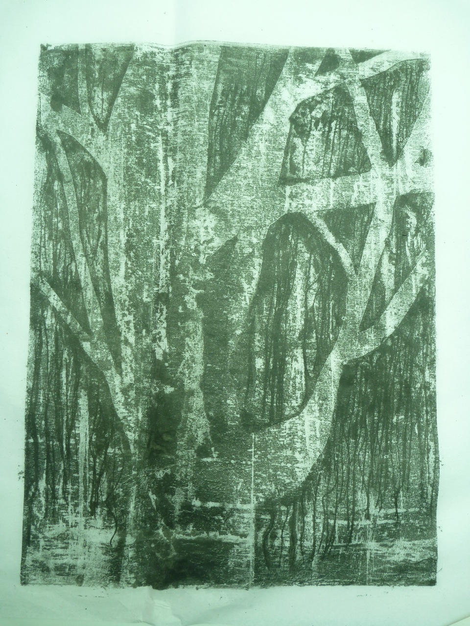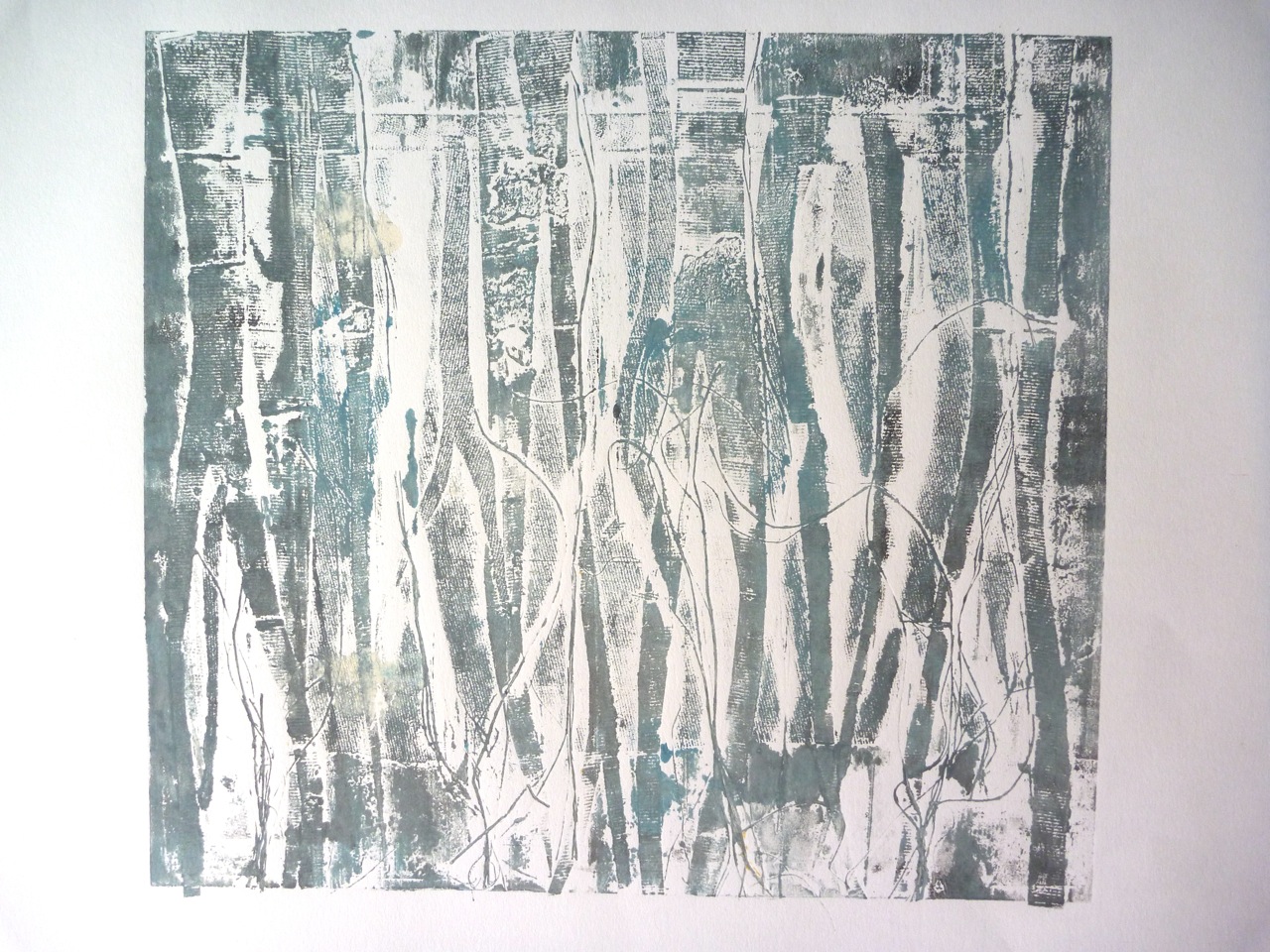 I started by monoprinting trees, focussing on lines and texture, and liking the smudged effects of ghost prints: