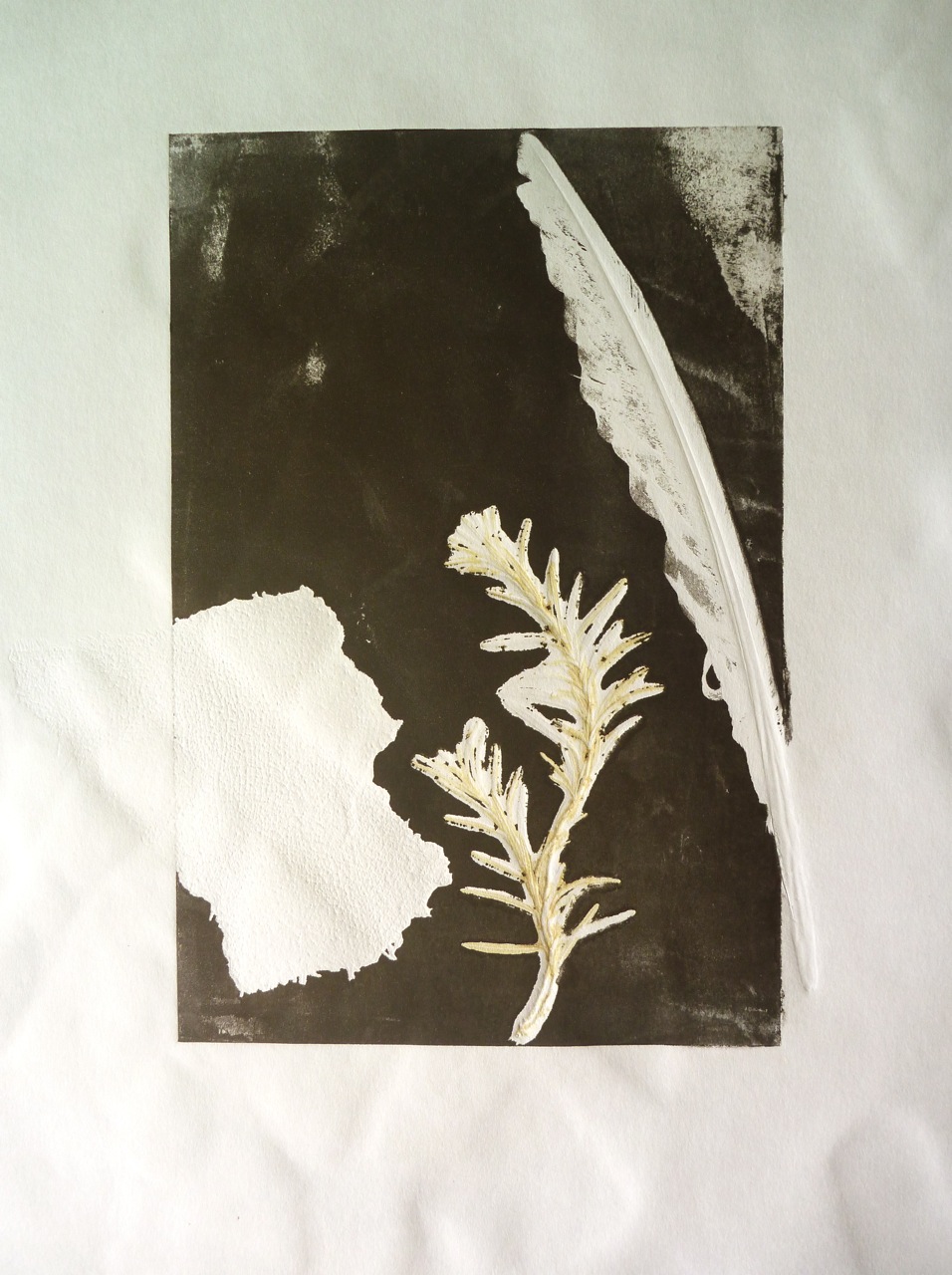 I had a quick go with the school press one day, and ran some real objects through on an inked plate: a piece of bandage, a feather, and a couple of sprigs of rosemary. Nice ghostly images from where the real objects block the ink, and then the ghost prints of the impressed sheet of perspex. I like the embossing it creates. Need to use better quality paper, and experiment with pressure of the press. What technique is this?? Just monoprint I guess.