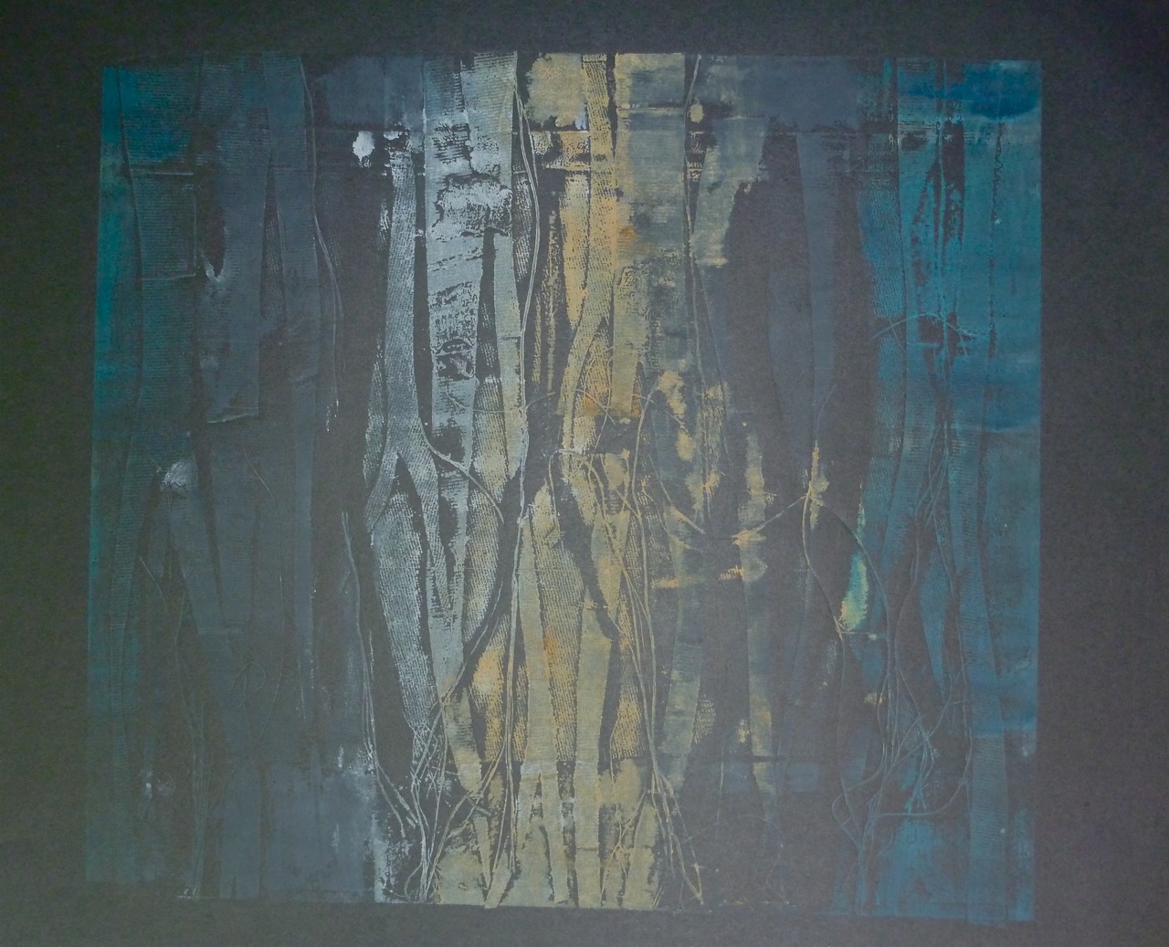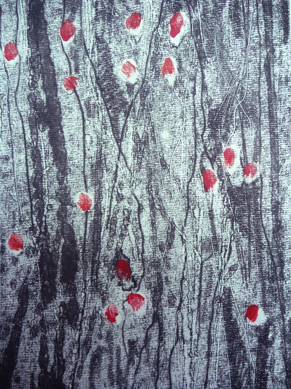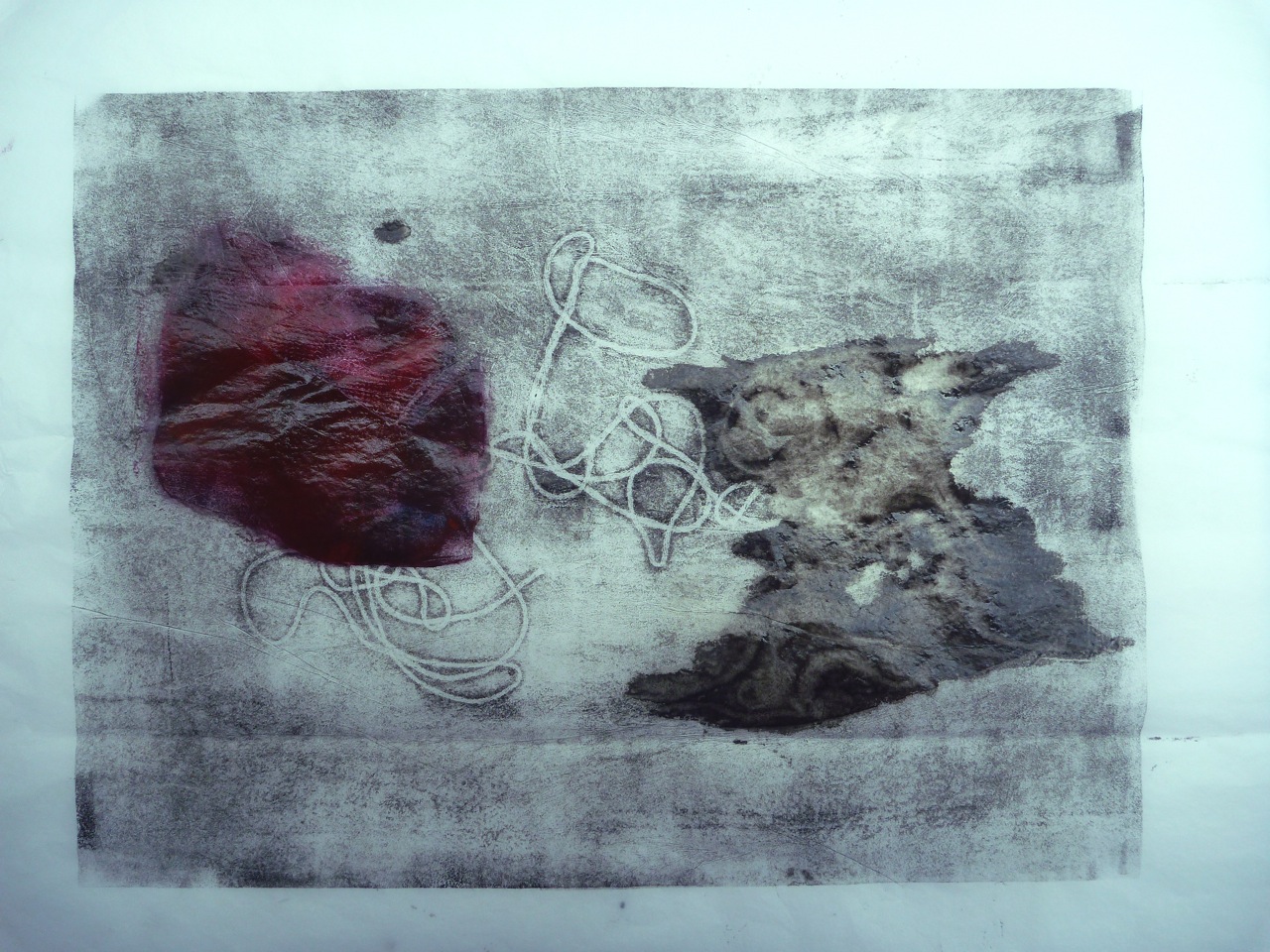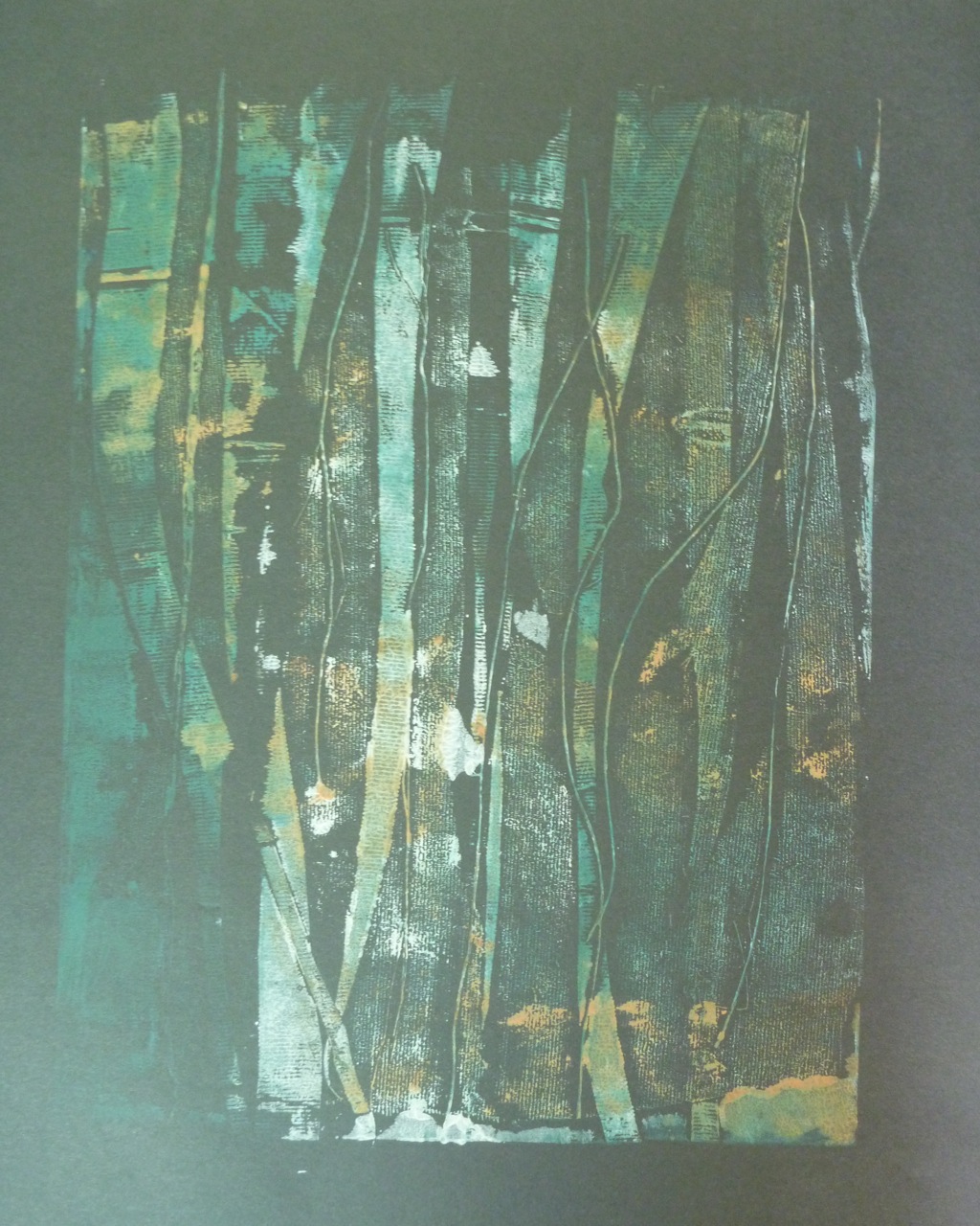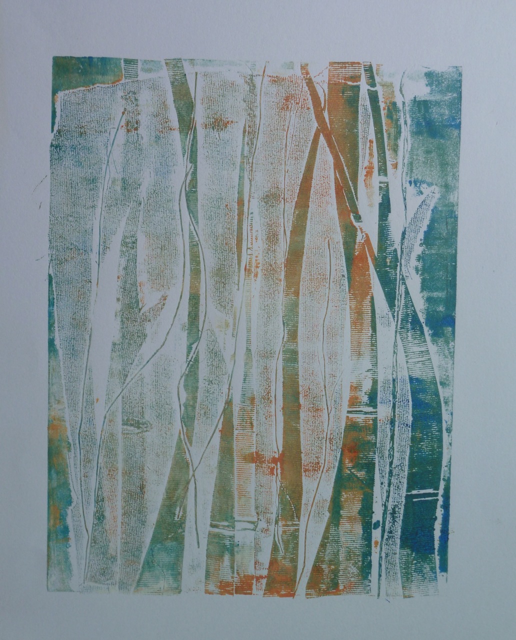 Evoking the romantic ghostly image of trees, this print also required the use of a press. Made from cut strips of a carrier bag with a ribbed texture, plus string, this was meant to evoke a forest of silver birch trees. Blotches were caused by me rushing and inking too heavily to get into the ridges.
