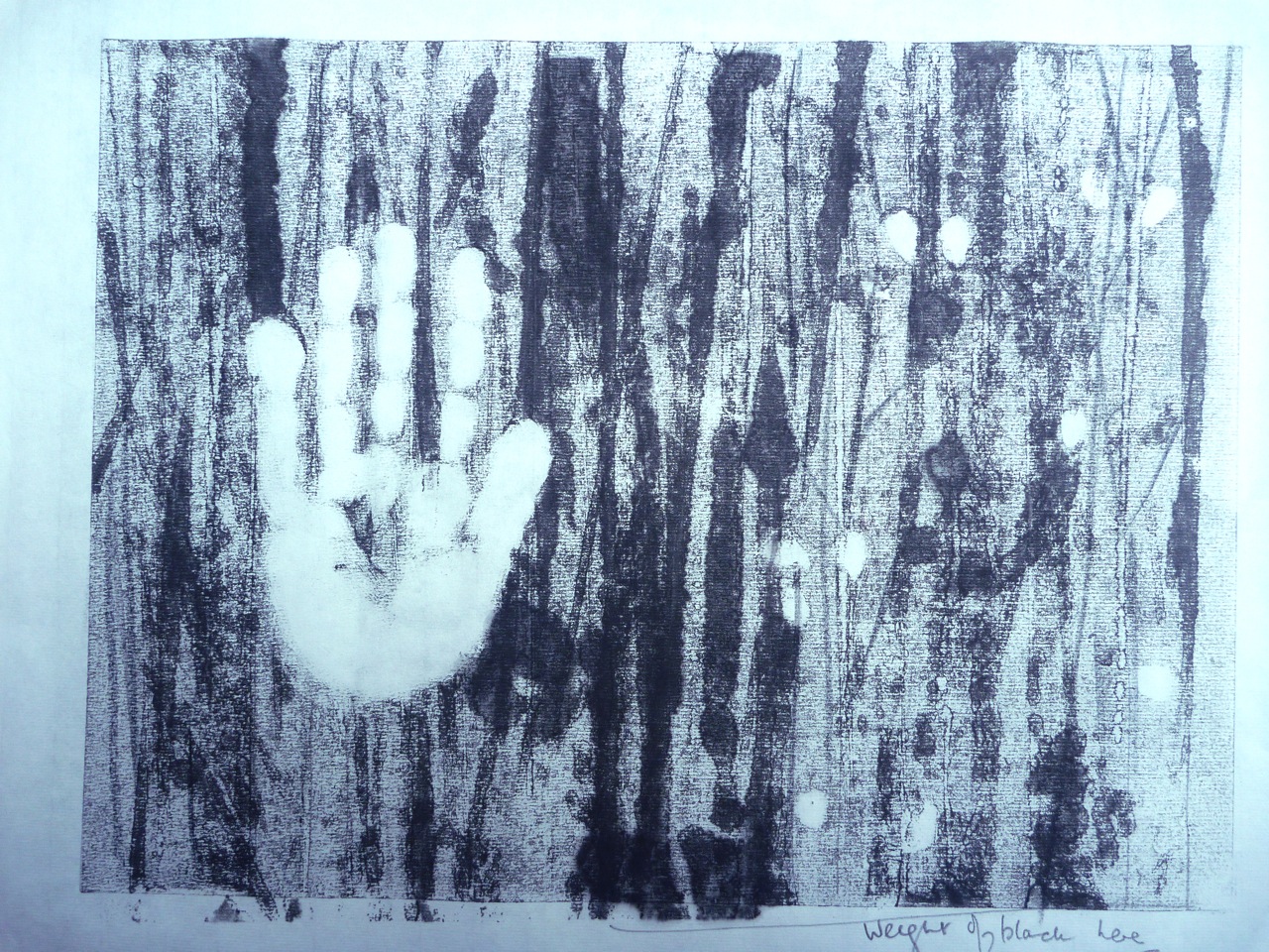 This as all getting a bit dark though, with the hand shape losing distinction, even with the backdrawing in a contrasting colour, and so I thought of creating panels. I tried to create the effect of the hand pressing against the surface, as if trying to get out, or trying to stop something. The mesh is a good contrast to the more organic shapes on the right, and i could have created more drama by distorting the mesh to suggest pressure. I was quite pleased with this, apart from the accidentally large blob caused by dripping too much turps. I particularly like the ghost print of the lifted threads.
