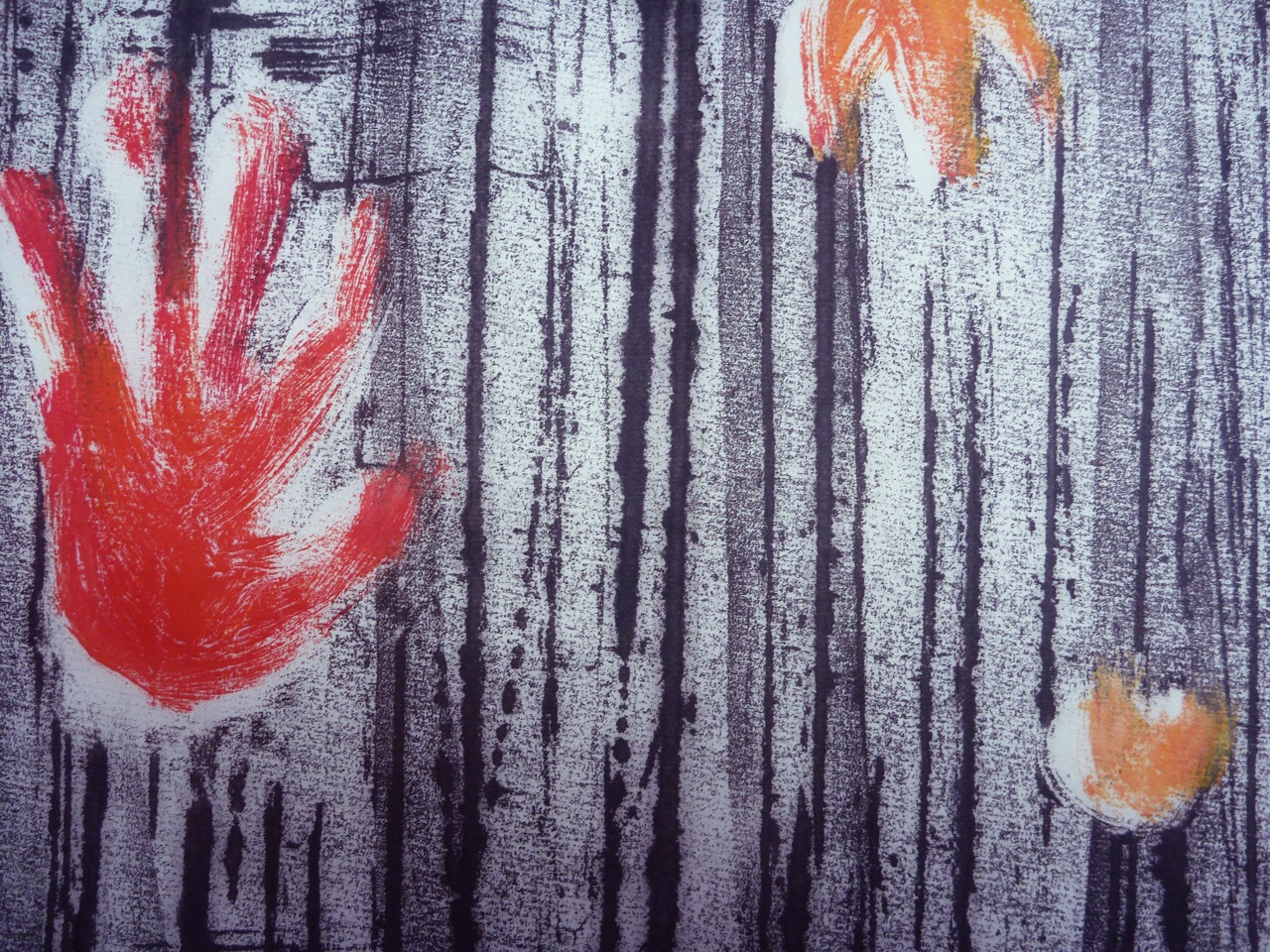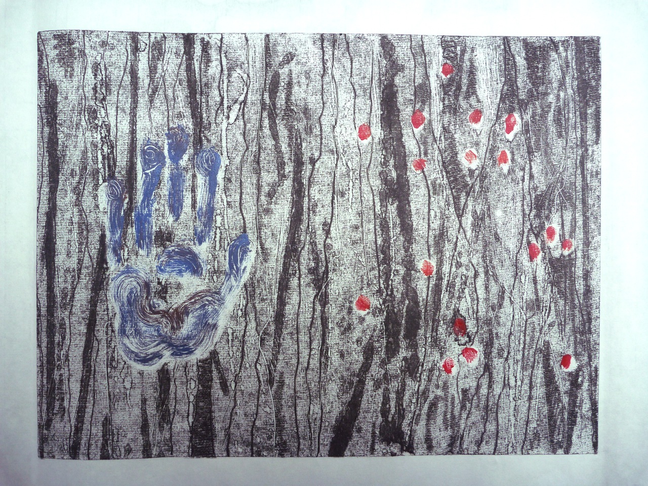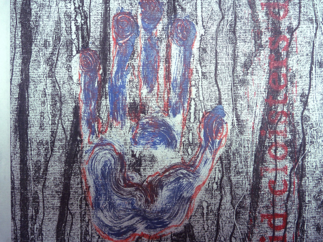 I decided to morph the flower into a hand, and to use an actual hand print to create a mask. I was thinking of Tapies’ prints, and of the exhibition I saw a while ago: Rupestres
