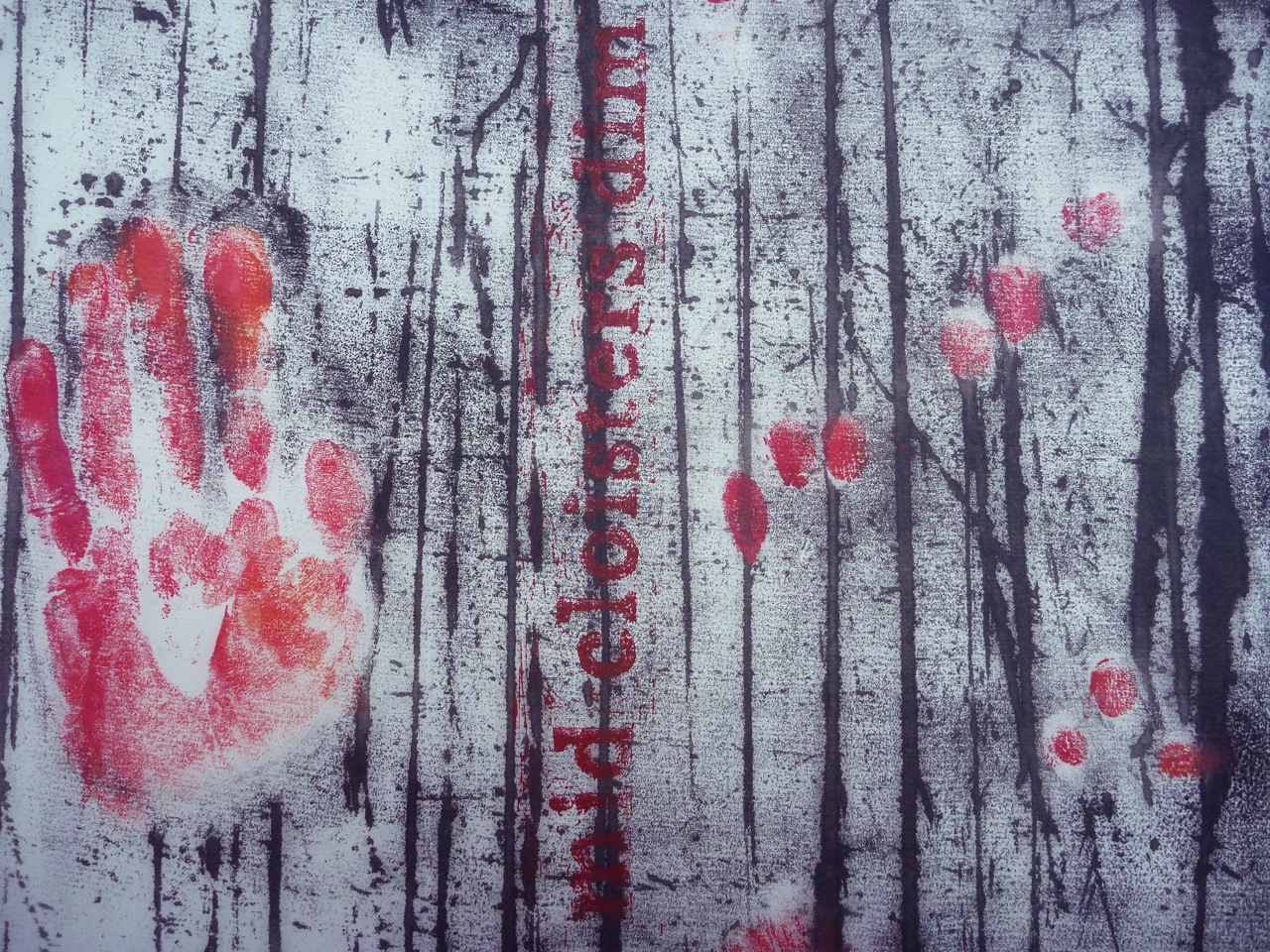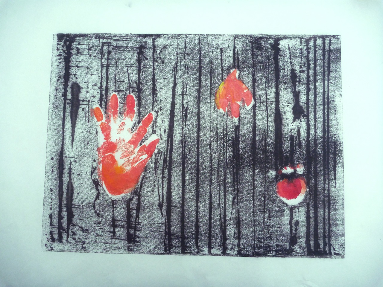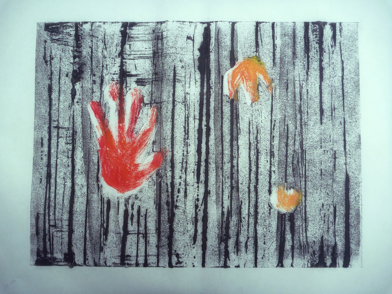 I decided to morph the flower into a hand, and to use an actual hand print to create a mask. I was thinking of Tapies’ prints, and of the exhibition I saw a while ago: Rupestres