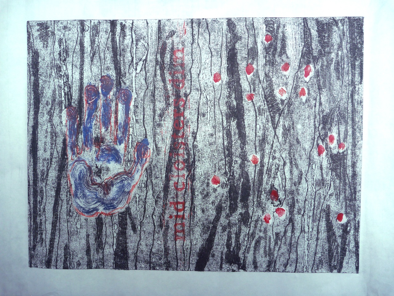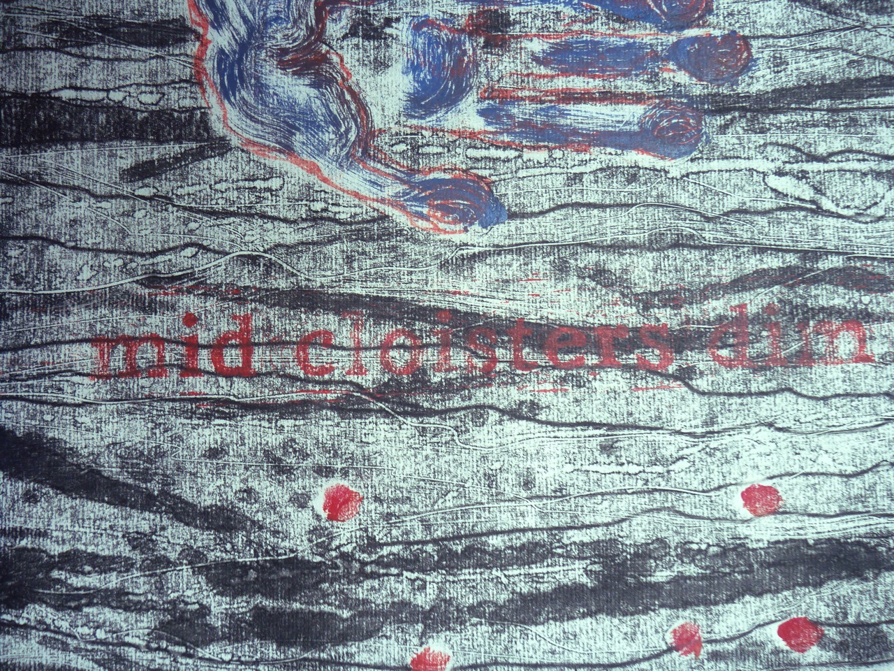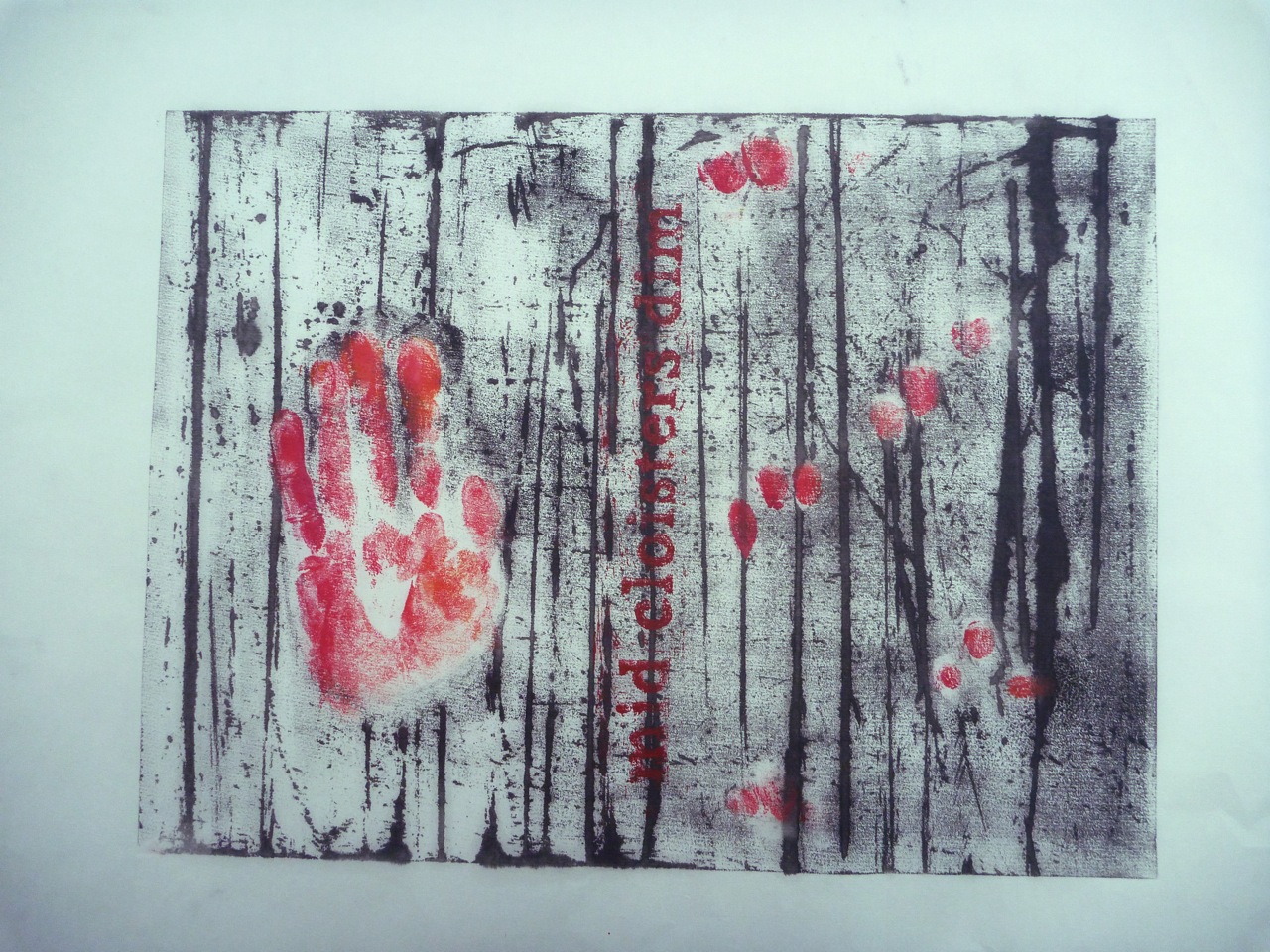 From this I started to have the idea of adding text. I carved the quotation “mid cloisters dim” in lino. (I liked the palindromic look of this, as well as thinking it fit the context of nature spoiled by human hand). The semi-transparent paper was a help in registering the hand and finger-prints: they were printed onto the plate then lifted off, using a ghost print in reverse as the template.