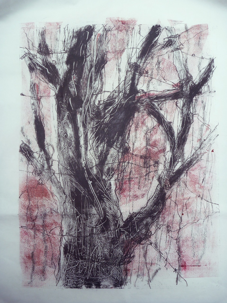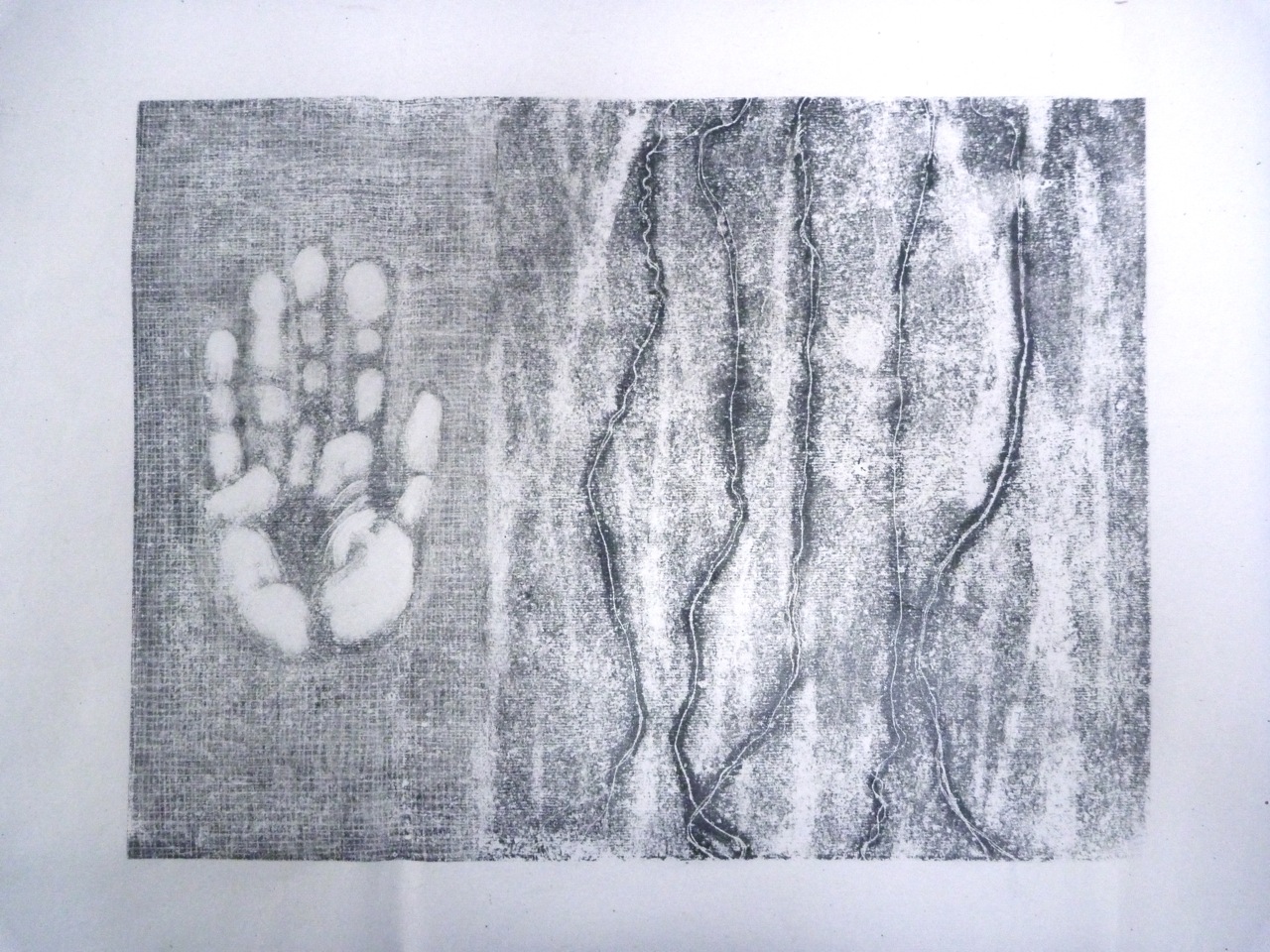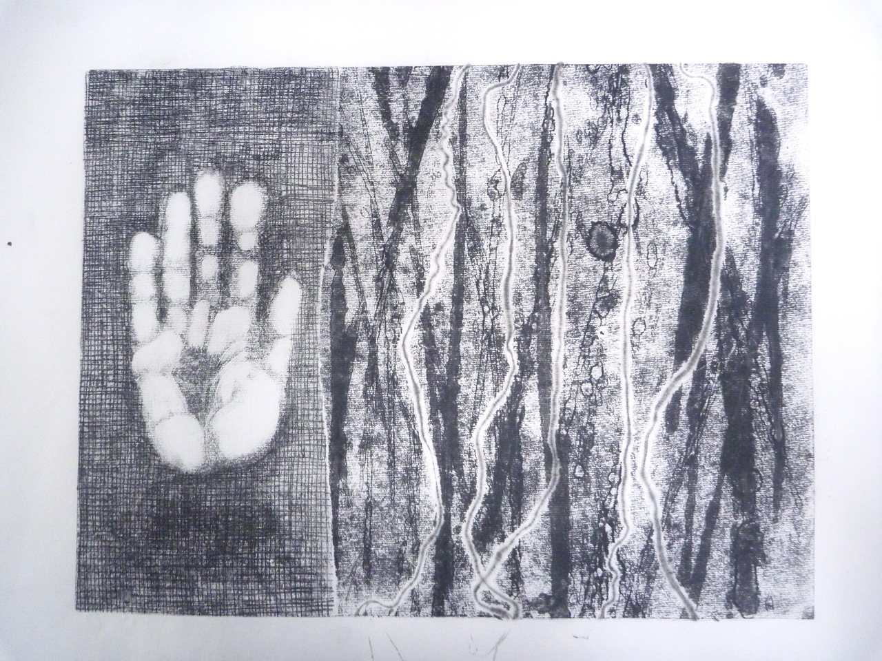 These morphed into realistic hands and flowers, so there were two panels, suggesting both an imprint in cement and growth on a tree. I started using turpentine dropped onto the plate to life the ink off and create vein-like patterns, as well as backdrawn and scratched-off lines. The masked parts were then printed into by using a ghost print as a template under the perspex printing plate. The Ingres pattern on the paper was effective too.