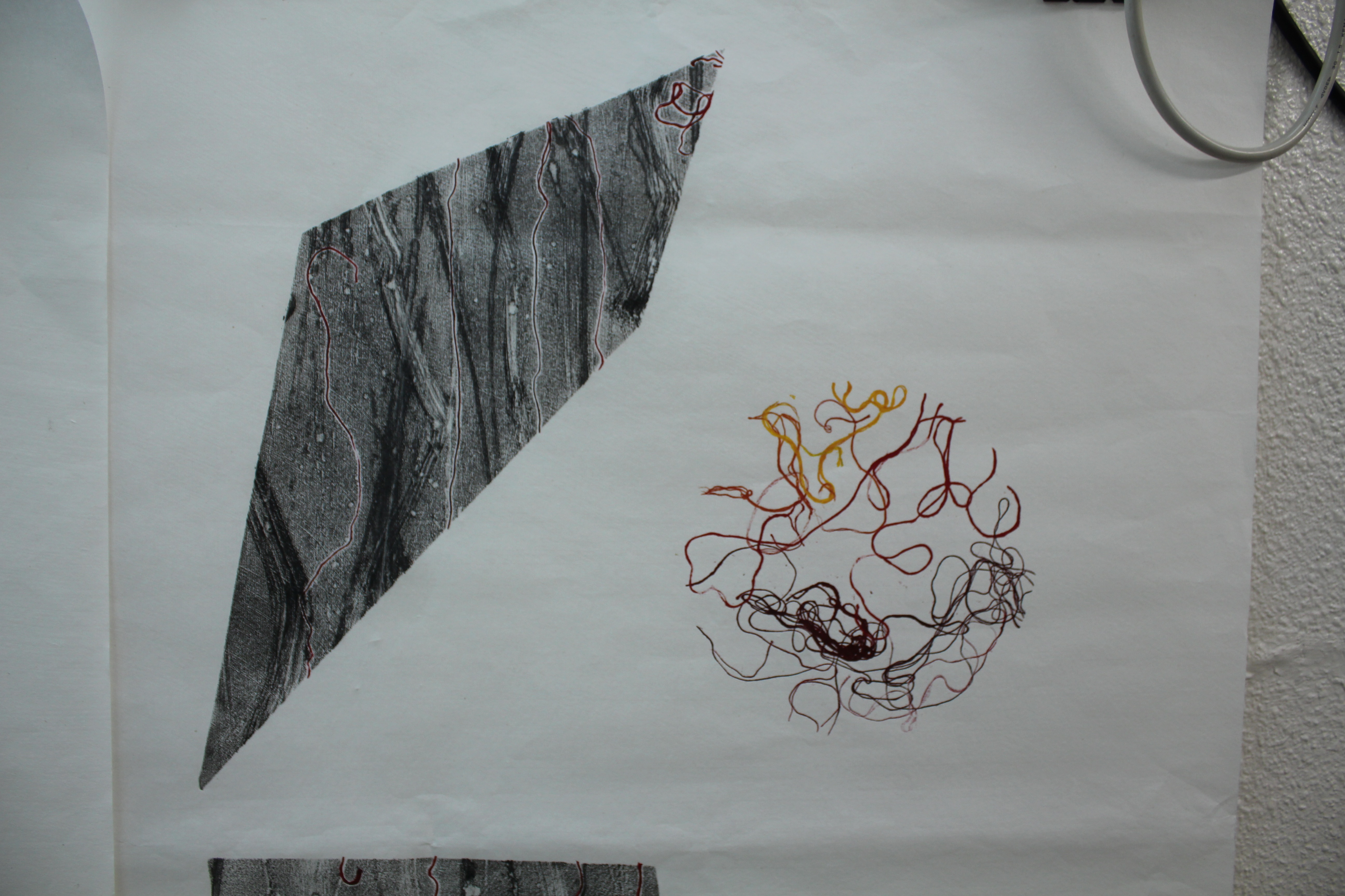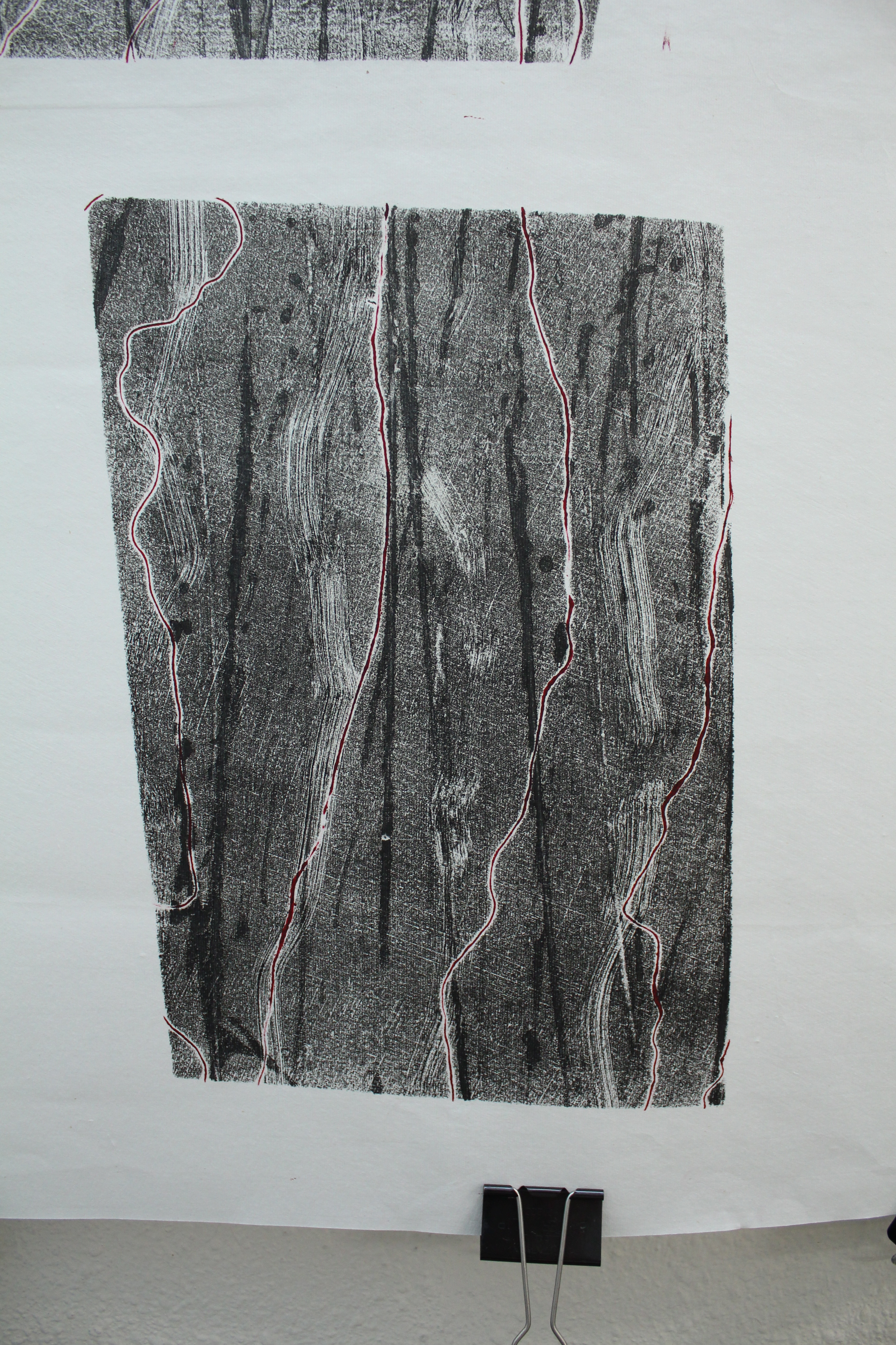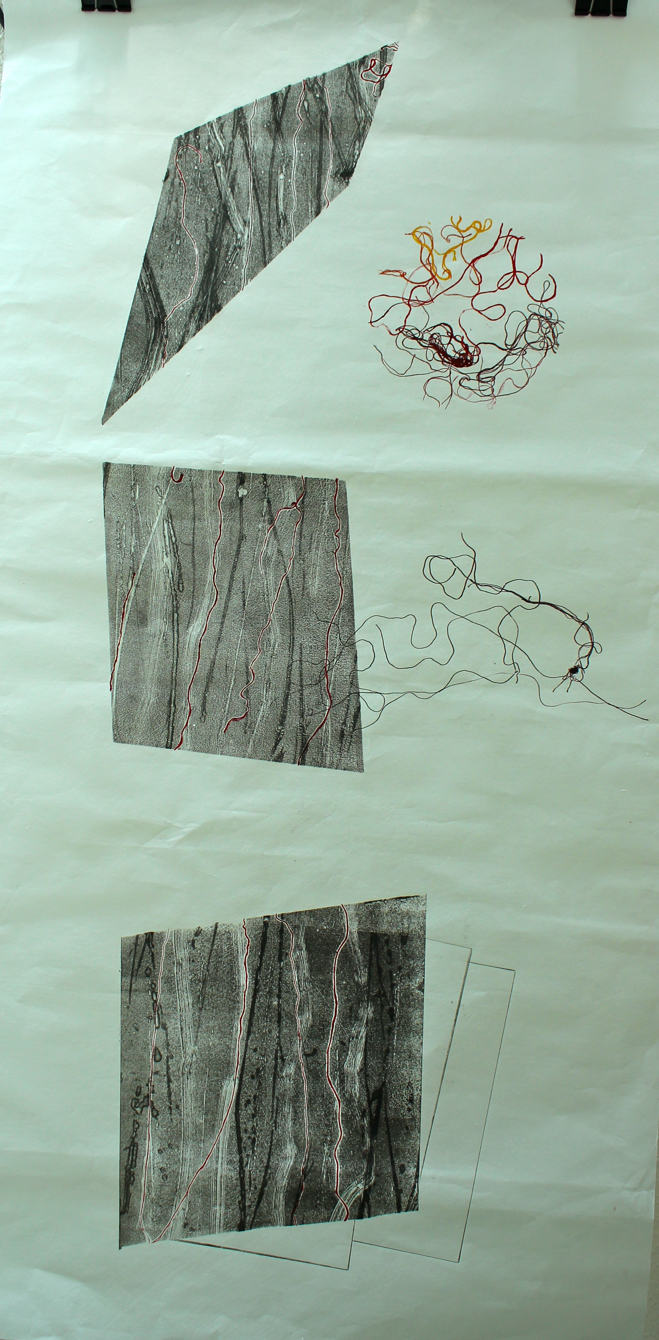 Landscape This is not a conventional landscape, but it has arisen from observation of the environment and is some kind of comment on it. The final prints use the same monoprint technique as the previous exercises, but I decided to make them sharply geometric, floating, as on constructivist images, and ironically ungrounded. The first idea I had was to create slices of bark, signifying the cut trees. This is done on a single rice paper scroll.
