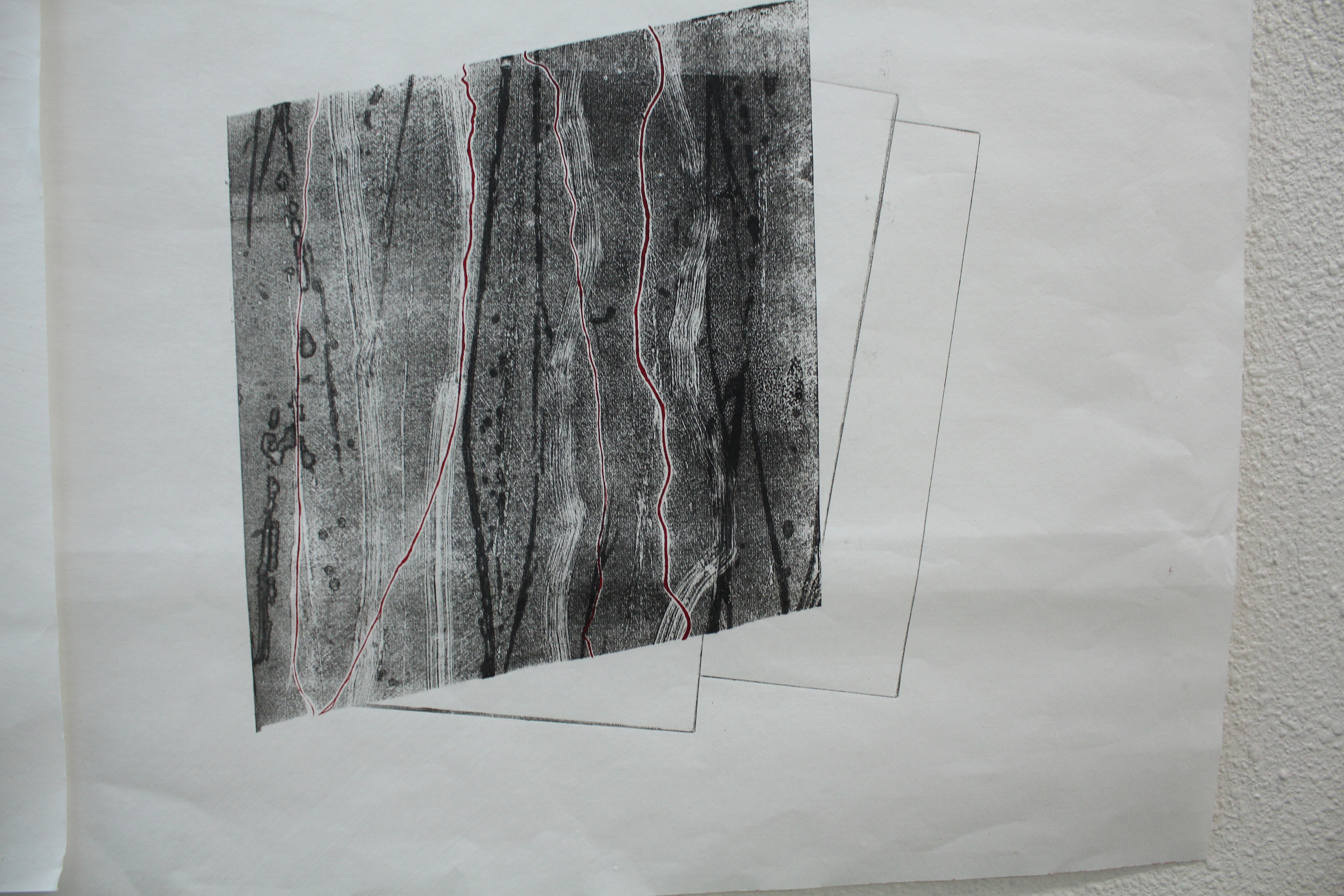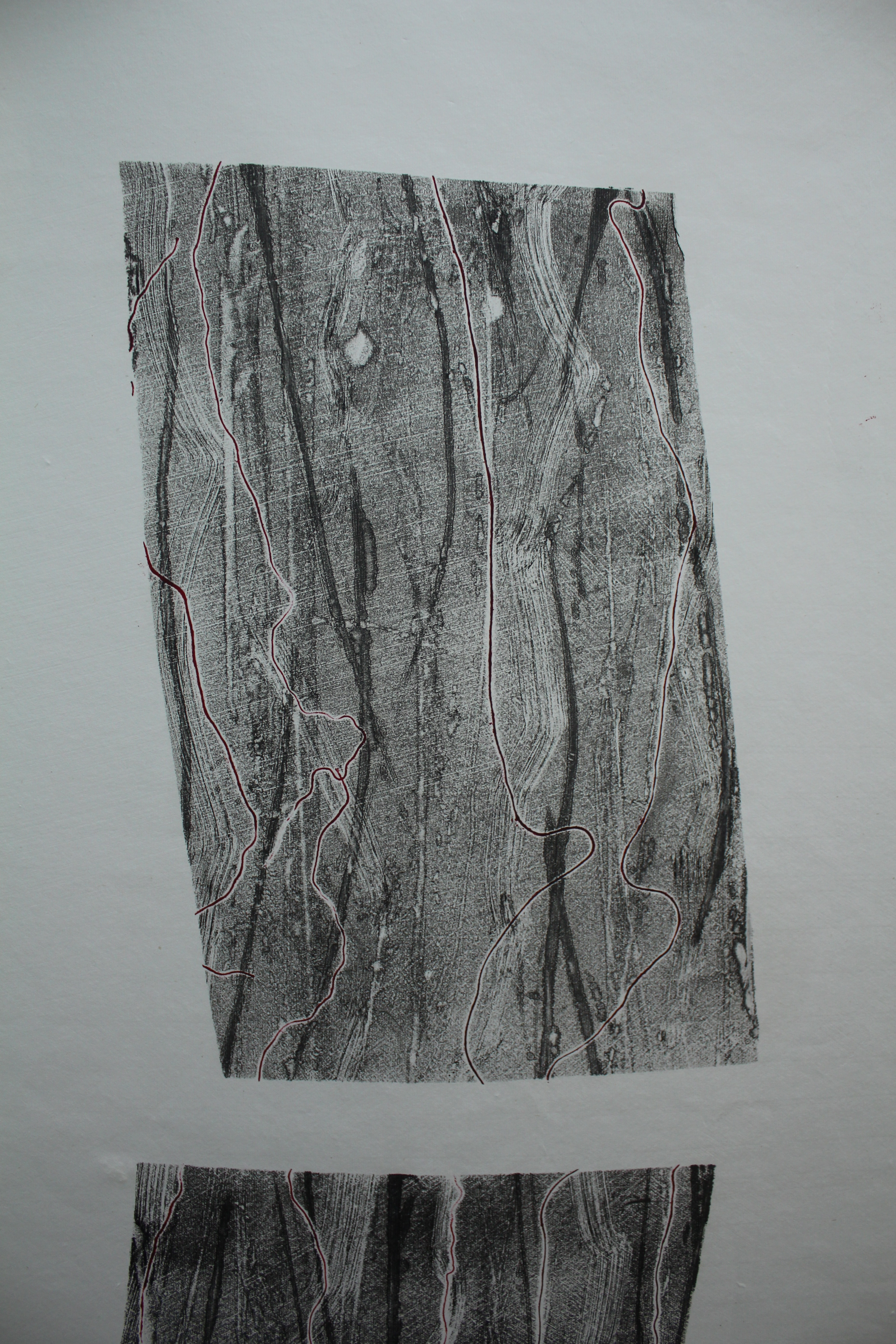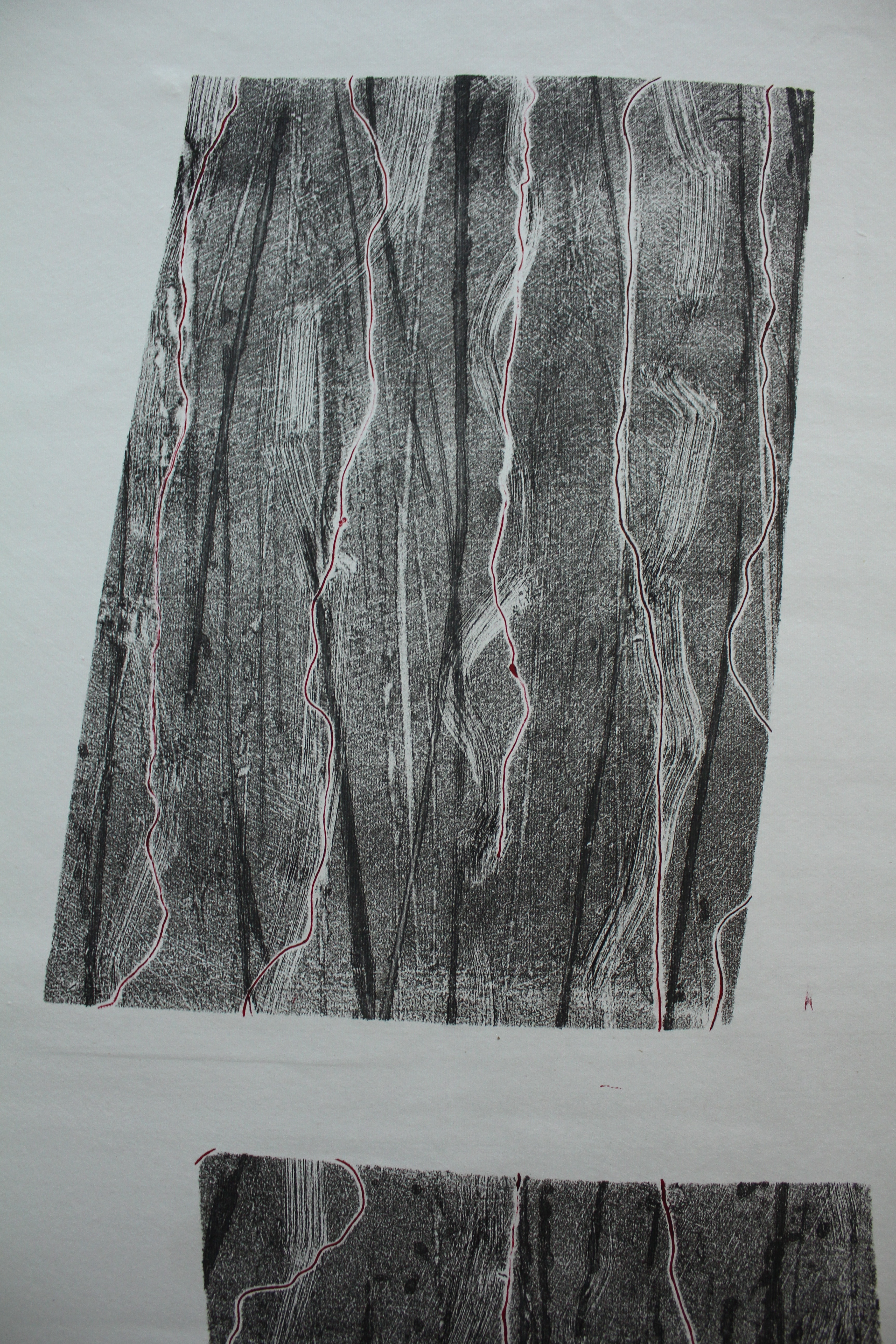 This, I thought further, reflected the way the natural environment is being treated, commodified and turned into geometric shapes for development, and I decided to make floating parallelograms that could be read as rectangles viewed from and angle as if floating above the white paper. Then I decided to “draw” out the threads/ veins of the bark/ trees, to create a narrative progression, suggesting to me that as the images move from bottom to top, there is a process of construction to deconstruction, evolution to dissolution, closeness to distance, concrete to abstract. In the top image, there is a sense of resolution in the opposition/ separation of shape/ line/ forms, but a complete loss of perspective.