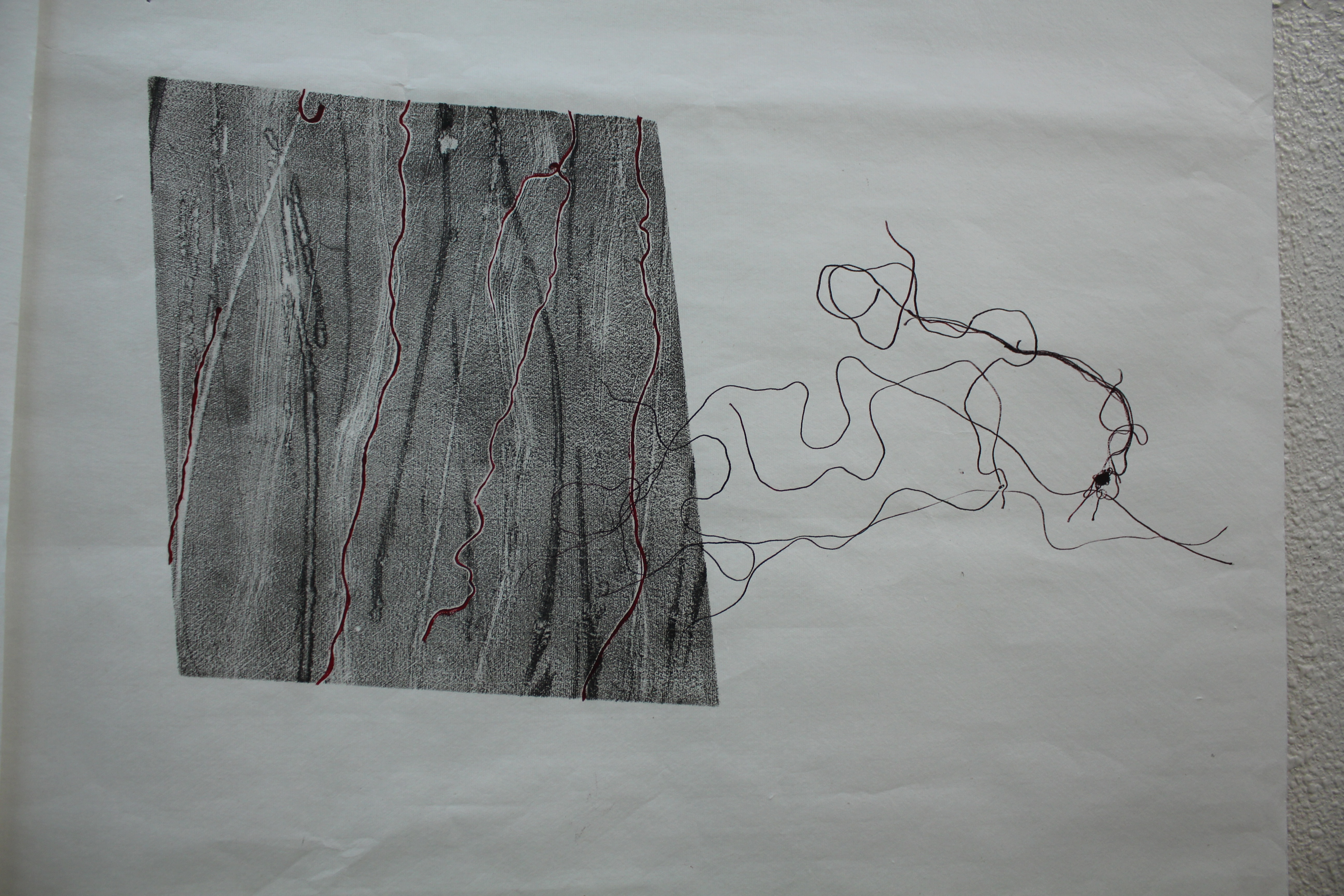 Reflective Commentary Added post-tutorial, where it was suggested that this is an omission. This series of prints, “Land” and before it, the “Mid cloisters dim” prints, emerged from a response to my immediate environment, from my reaction to change being wrought on the natural environment, the mass destruction of trees and the imposition of large oppressive structures. It evolved through observations of textures, materials and the relations between them, into he creation of analogies with emotional overtones, trees clutching the earth, flowers like disembodied hands, signatures and stamps imprinted in concrete, which coalesced into a concept of “human traces” and mark-making in a brutal sense. This evoked a poem which has inspired me before, “Frost at Midnight”, by ST Coleridge, in which the poet celebrates nature and bemoans the spiritual loss when forced to live apart from it, “mid cloisters dim”. I’m conscious of this is a personal theme, visited before in prints on “The Dream of the Rood”, which related trees, violence and casual neglect through the Old English poem of that name, a mediation of the “rood” on which the crucifixion took place. This series developed as a more abstract exploration of shape, line, mark-making and texture, via the “mid cloisters dim” more pictorial/ verbal stage which included a recognisable image of trees and an intaglio print of the verse, from which the idea of a series of broken but related shapes emerged. The shapes were conceived as a series, rather than a group, and thus evoking the sense of narrative which was influenced by the prints of Xu Bing. I struggled for a while to understand the tutorial comment that the final prints, the “Land” series, had had too much added with the monoprinted threads, as at the time, I felt that the piece lacked balance, visually as well as semantically, and that the threads provided a counterpoint, resolving the image while the abstract shapes dissolved. I can see the minimalist argument however, and think of the works of David Nash, both prints and sculpture, which have a monumental feel.