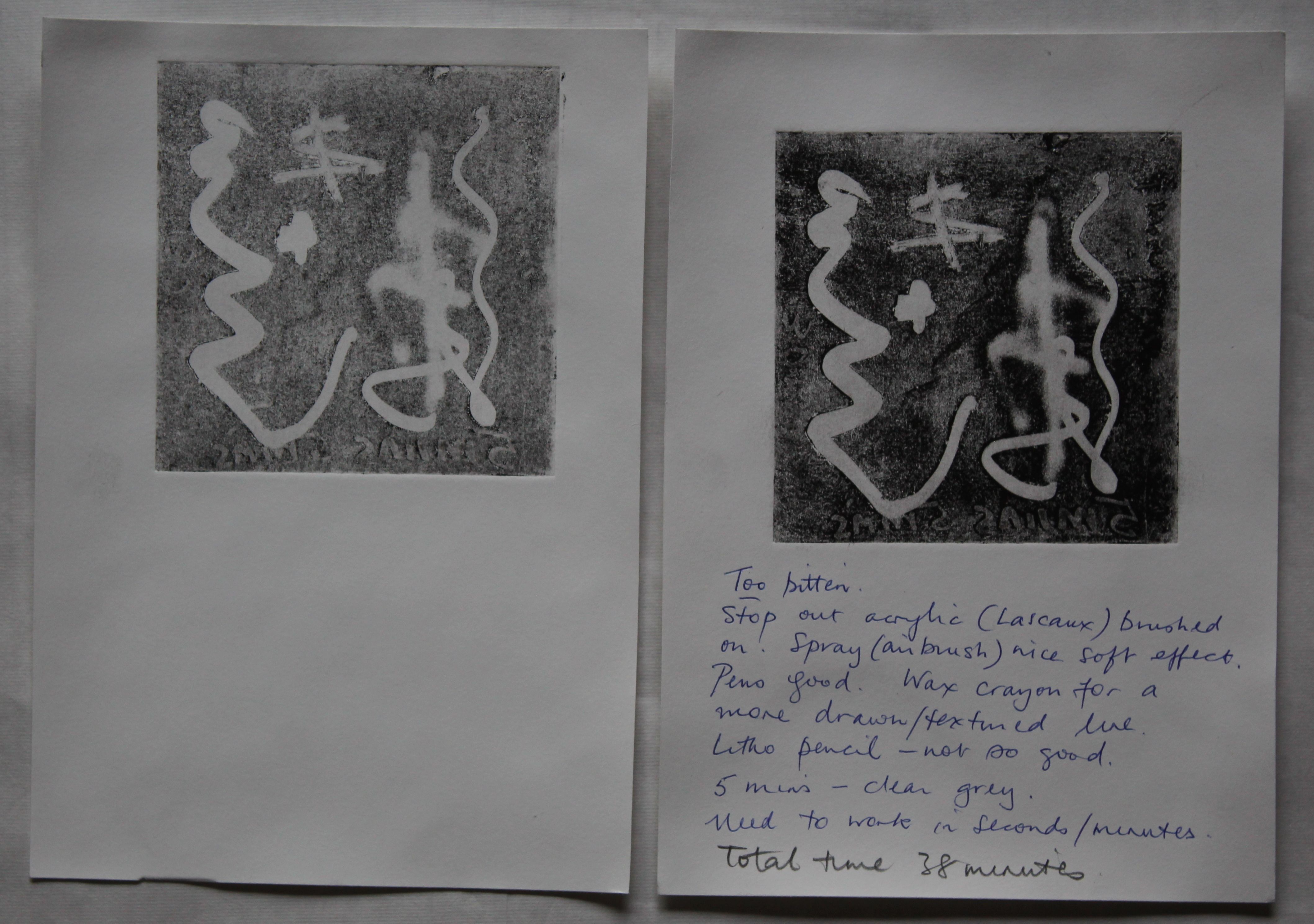 What this taught e was the difference in edges- the acrylic pens are very effective. The airbrush spray is softer. The shades of grey are not very distinct and tend to merge with the aquatint speckled effect in the shorter exposures. Litho pencil – less so- and wax crayon gives a drawn line/ texture. I realise I need to work in shorter intervals but recognise the 5 minute mark as a clear grey.