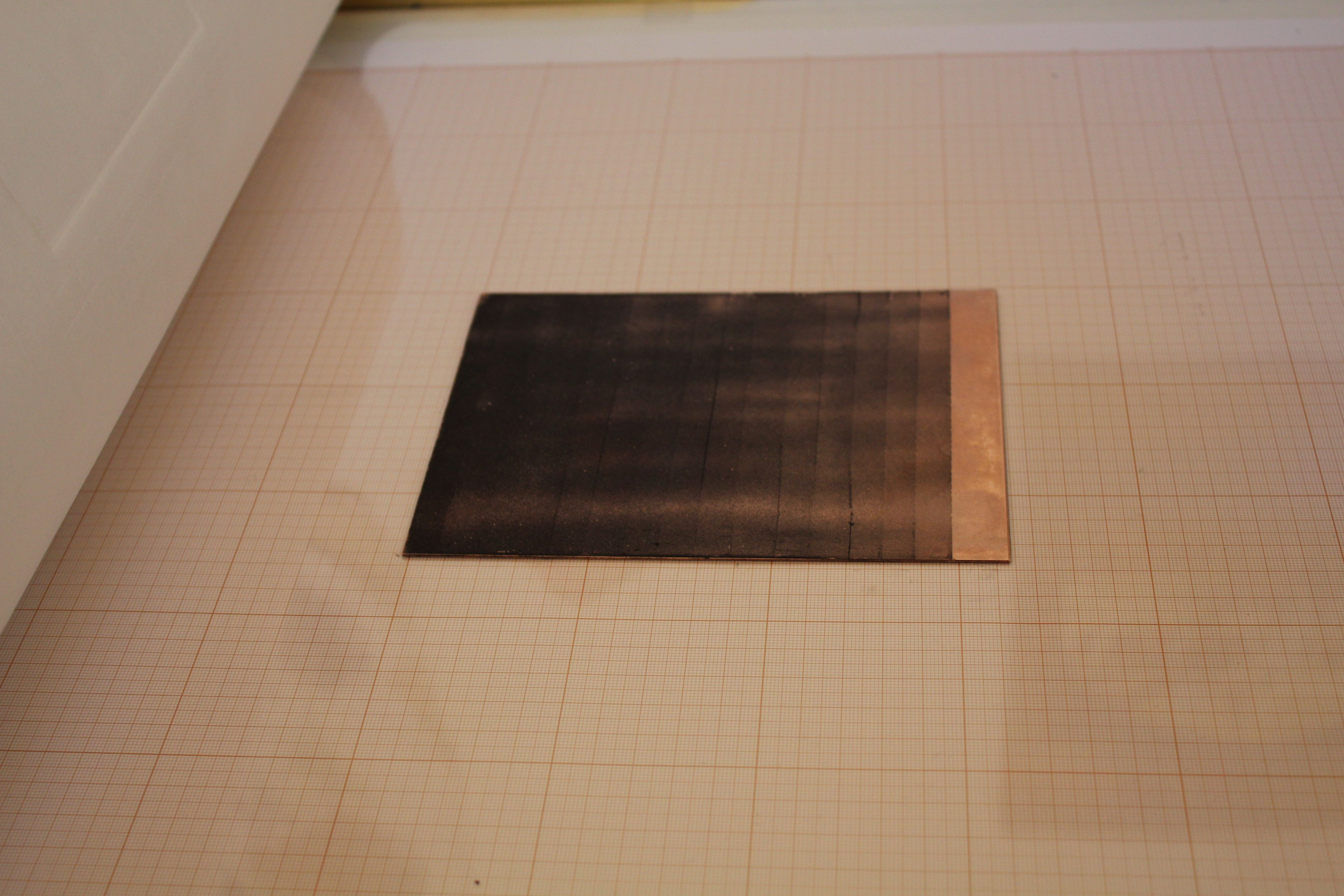 Opened a new copper plate, and filed the edges. Took the Mylar off one side and spent ages trying to get it off the other side before deciding there wasn’t any. De-greased it in soya sauce. Sprayed it with airbrushed aquatint, but didn’t get a uniform layer. This bit is hard. Left it to dry.