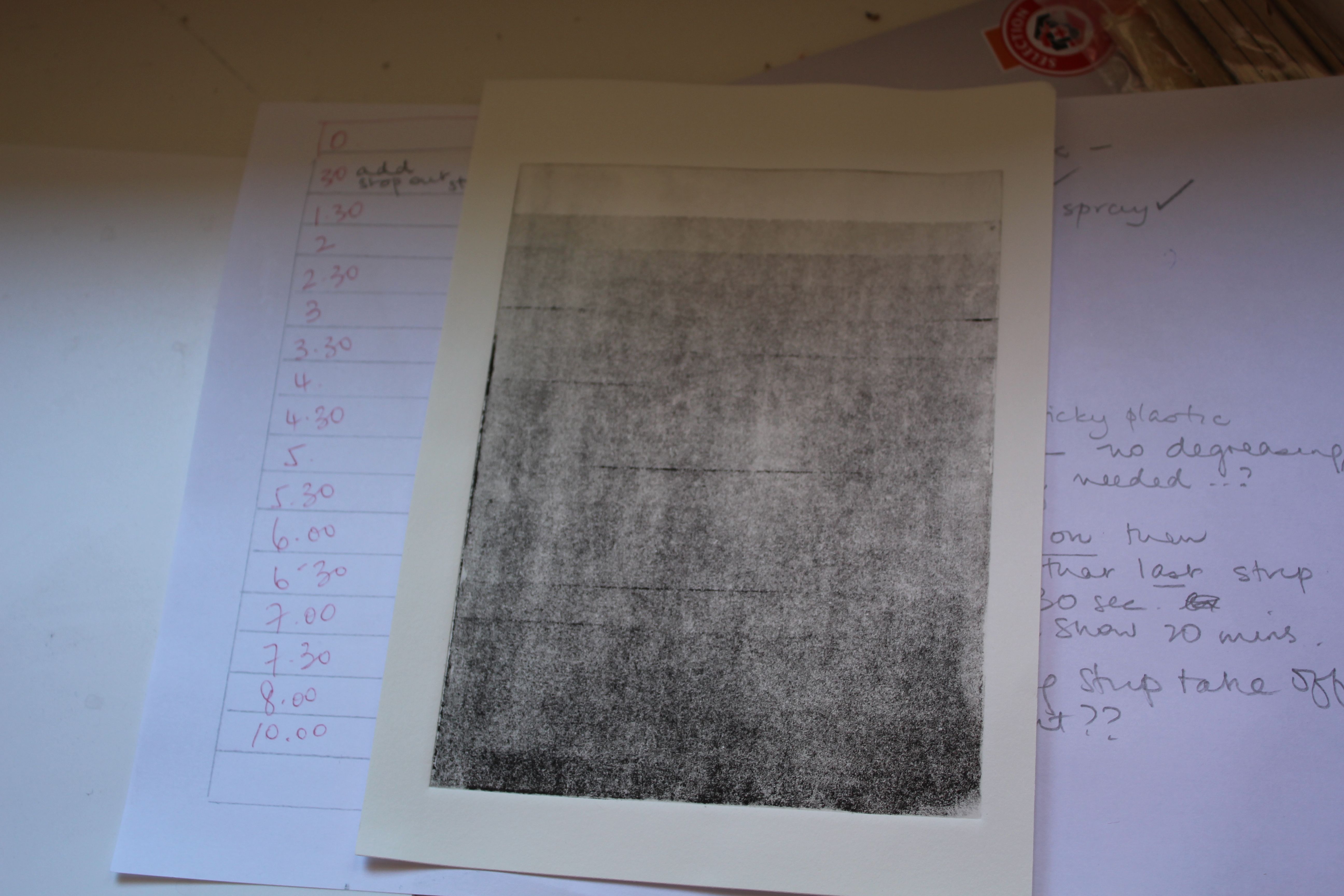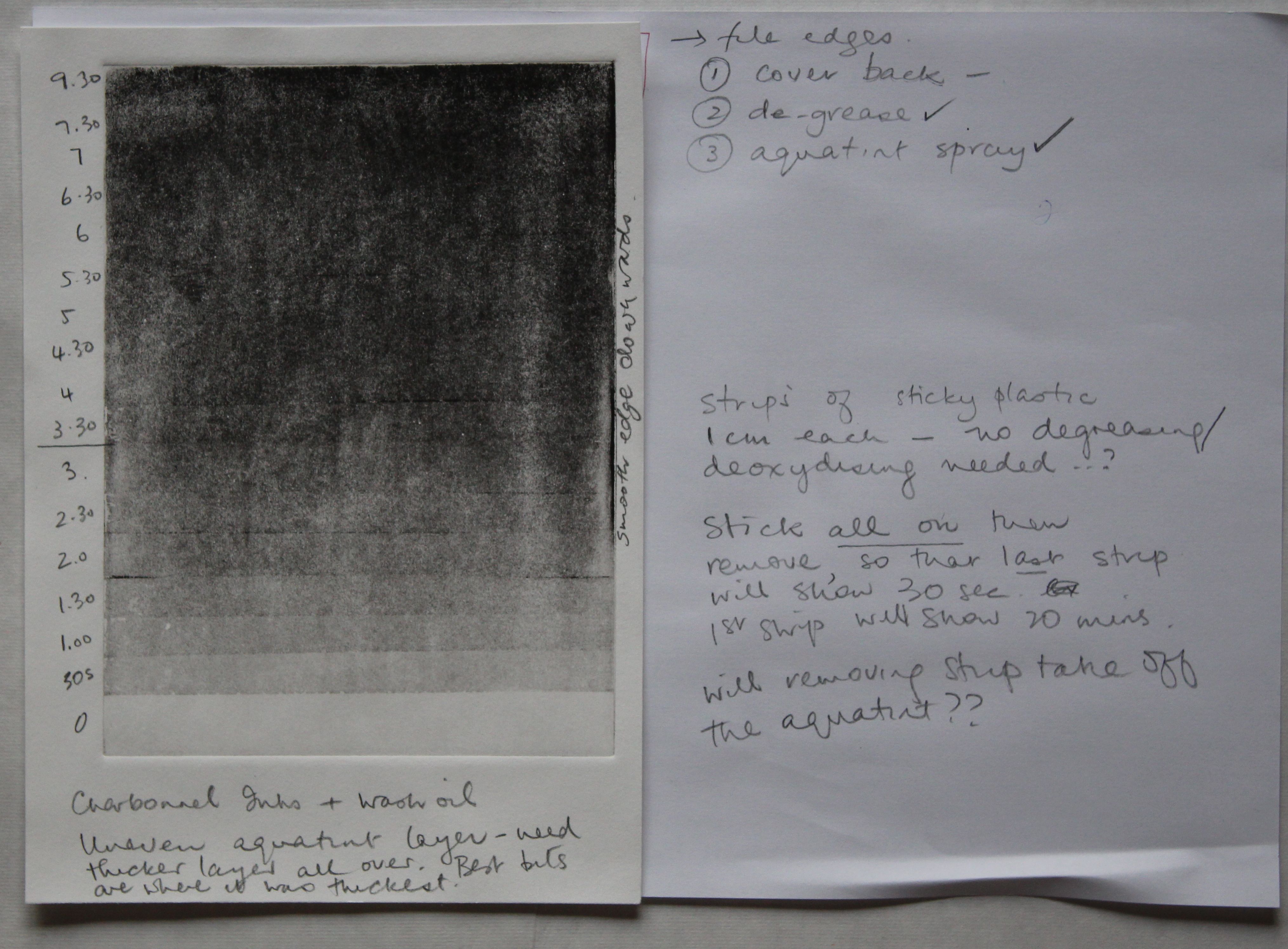 So, I printed that first plate. It was a bit blotchy. A total of 38 minutes was too much, but it was clear that the 5 minutes and thereabout etches got a nice shade of grey. I hadn’t been very systematic but it was a ball park figure. The stop-out pens worked well, gave clean lines. The airbrush sprayed on stop-out gave a lovely soft effect. The wax crayon was textured slightly. The litho pencil was a bit faint. So…
