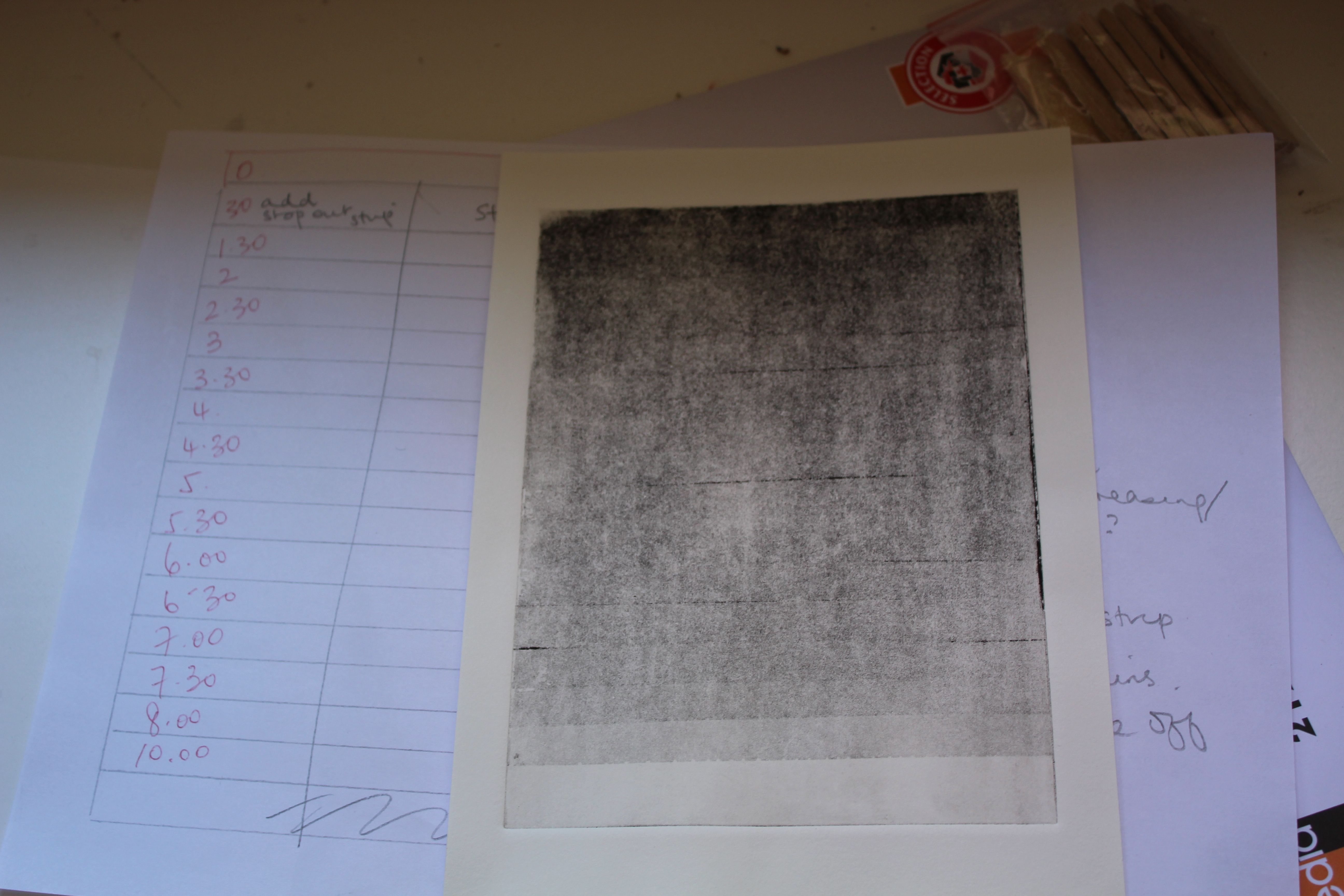 Printed it, and observed that the short times at the start were quite distinct- 30 seconds was quite different to one minute, and the stages up to about 3 minutes were clear to see. After that there was no clear boundary, and the colour just got gradually darker, though not absolutely black. Two or three possible reasons for that: