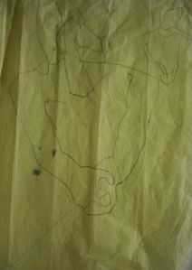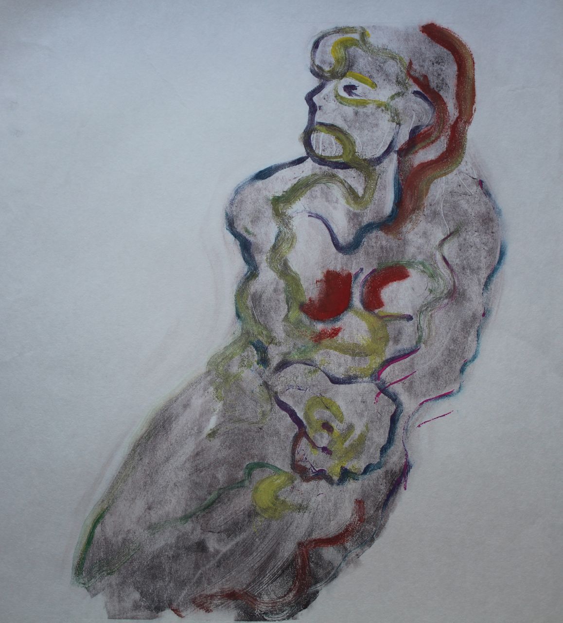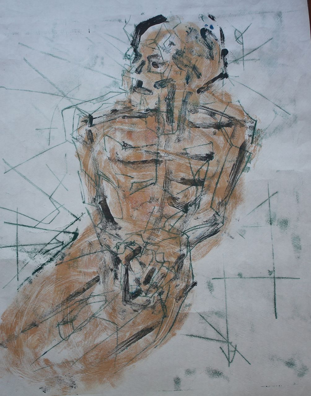 At the same time, I had to think of my resources. Monoprinting is the most straightforward when you have few specialist resources to hand. I had painting materials, ink, sheets of perspex, Chinese rice papers, tissue paper and heavier cartridge. The techniques that suggested themselves were transferred paint, masking, and backdrawing so I had my “language” of seeing in the form of shape, colour and line. At its most basic, any form of translating a solid 3D person into a pattern of shape, colour and line, is a process of abstraction.