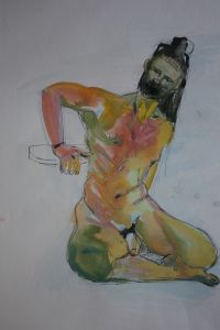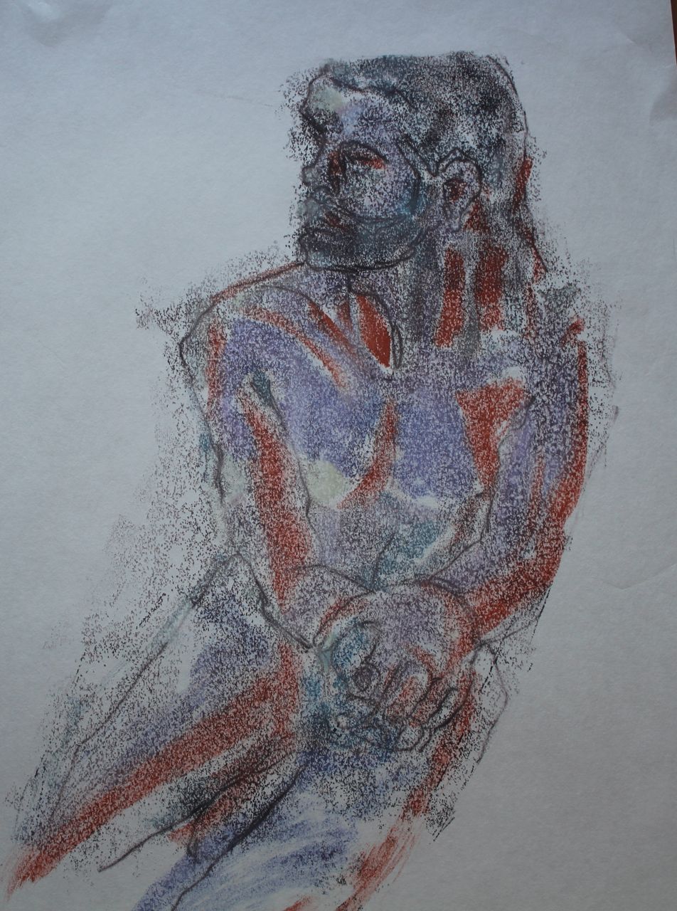 The second image is using the soft mottled colours of wet paper, and backdrawn outlines, but the two layers of the print exist separately, and emphasise the artifice of both. The body seems to be a collection of atoms, barely held together by a porous outline, man as construct. Now the pose fits too, coincidently, as the image of the folded hands mirrors the idea of encapsulation.