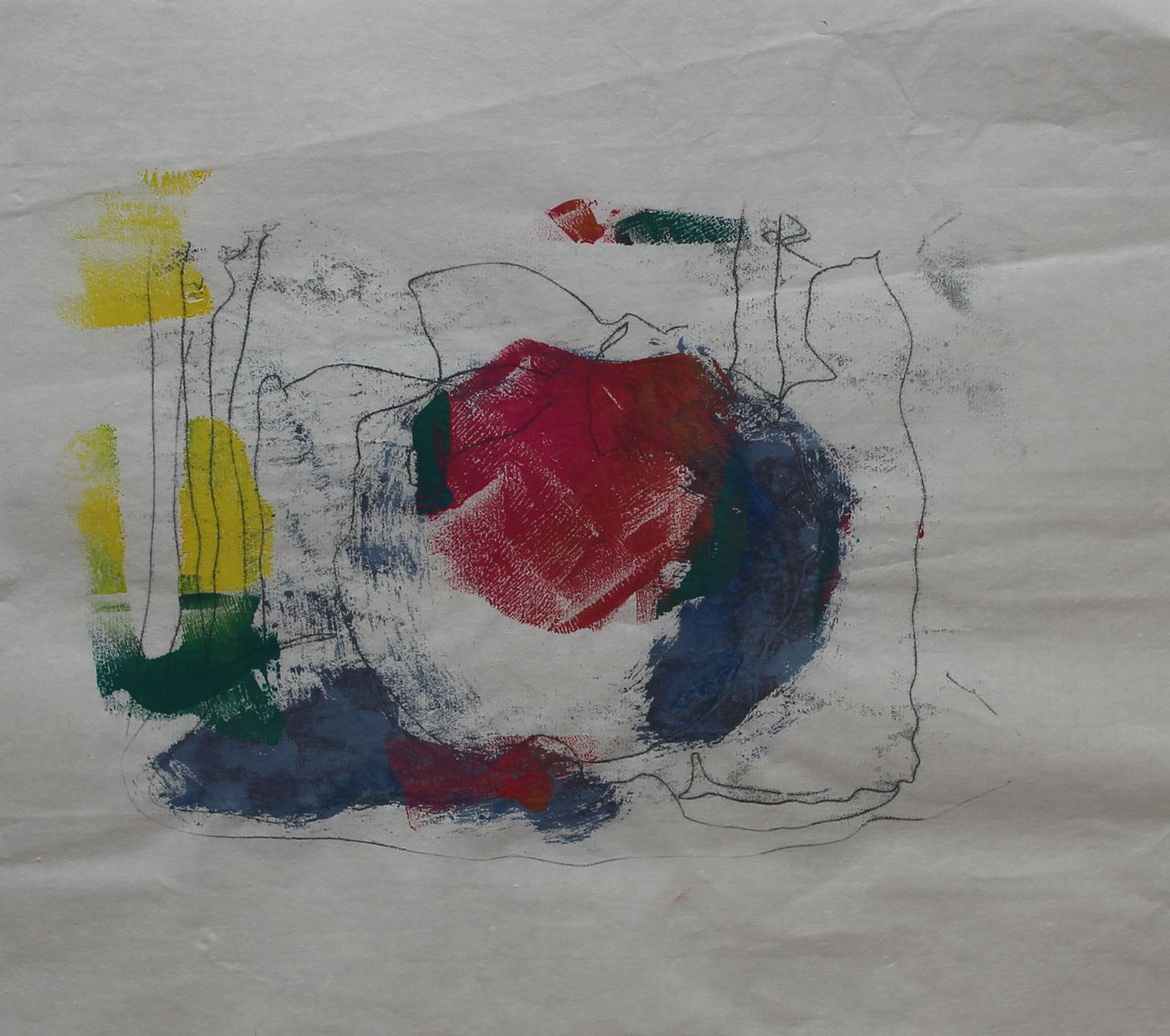 This wasn’t inspiring though. Below, this was the first print that I felt enthused by- a fast impression of a group of objects- apples, a plate, a bottle, a cloth- torn masks, blind painted and then blind backdrawn. This shows the three elements of shape, colour and line as three distinct entities. The texture of the lines, the textures of the colour and the fluidity of the shapes, suggest things trying to come into being, to form themselves using this visual language, parallel to how Cubist paintings resolve themselves from splintered planes.