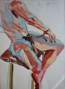 So I tried to use the figure in the same way, using a mask, painting and backdrawing, The mask creates an empty space and a negative shape. Warm and cool colours and white spaces suggest form, and an illusion of 3 dimensions. Backdrawn lines posit an alternative space to the masked shape. Mis-registration is the element that creates the “abstraction” from life, the deliberate juncture with reality. That is to say, the “language” of printmaking can do the job of suggesting that what we see is an unstable thing, dependent on perspective. On the other hand, the images also suggest movement, in the same way as “Nude descending a staircase” works by showing transitions into and out of a place in time, as if the figure is getting into or out of position. The separate elements “become” a figure because we interpret it from our habits of seeing.
