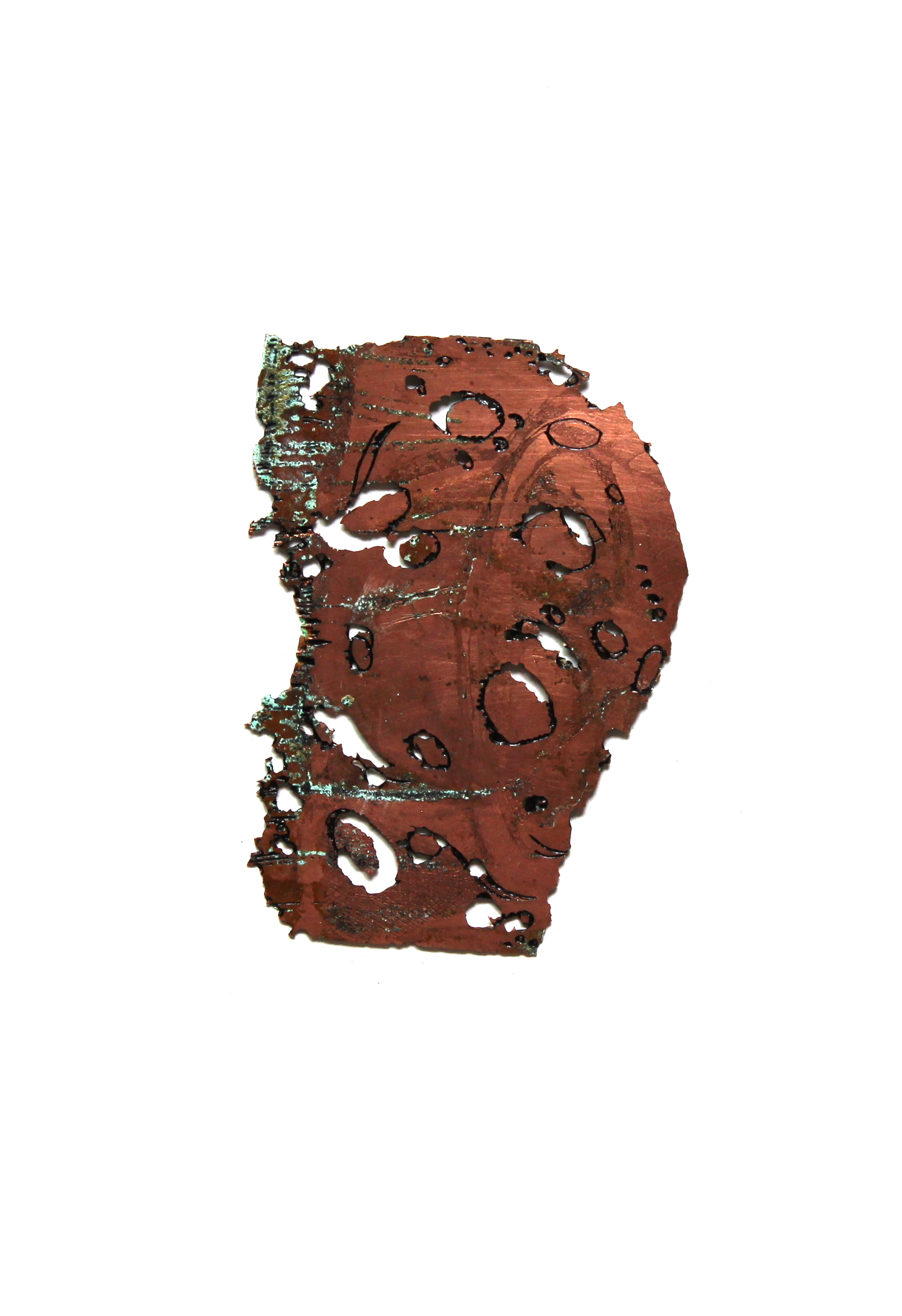 I masked one side – the one immediately above- with a plastic shape, roughly like a wave, covering just over half, then masked the other side with a layer of Lascaux hard ground, mirroring the same shape. On the hard ground, I etched lines, concentrating on the already weakened areas, and adding shapes suggesting holes. Then I put it in the ferric chloride overnight.