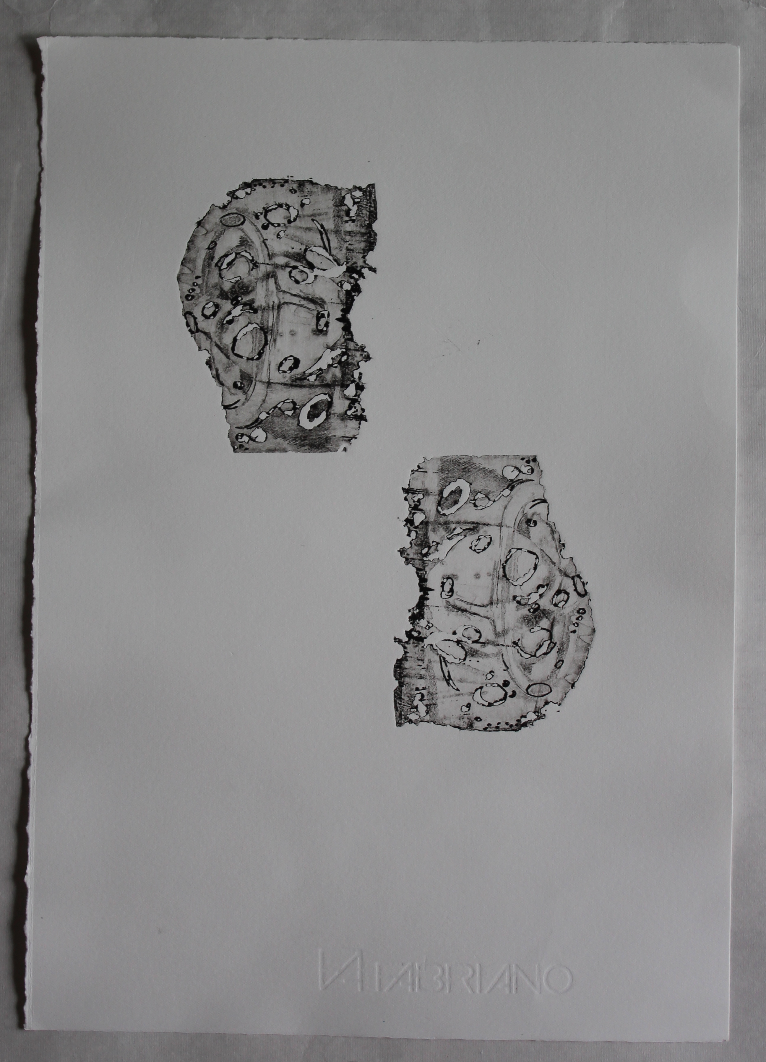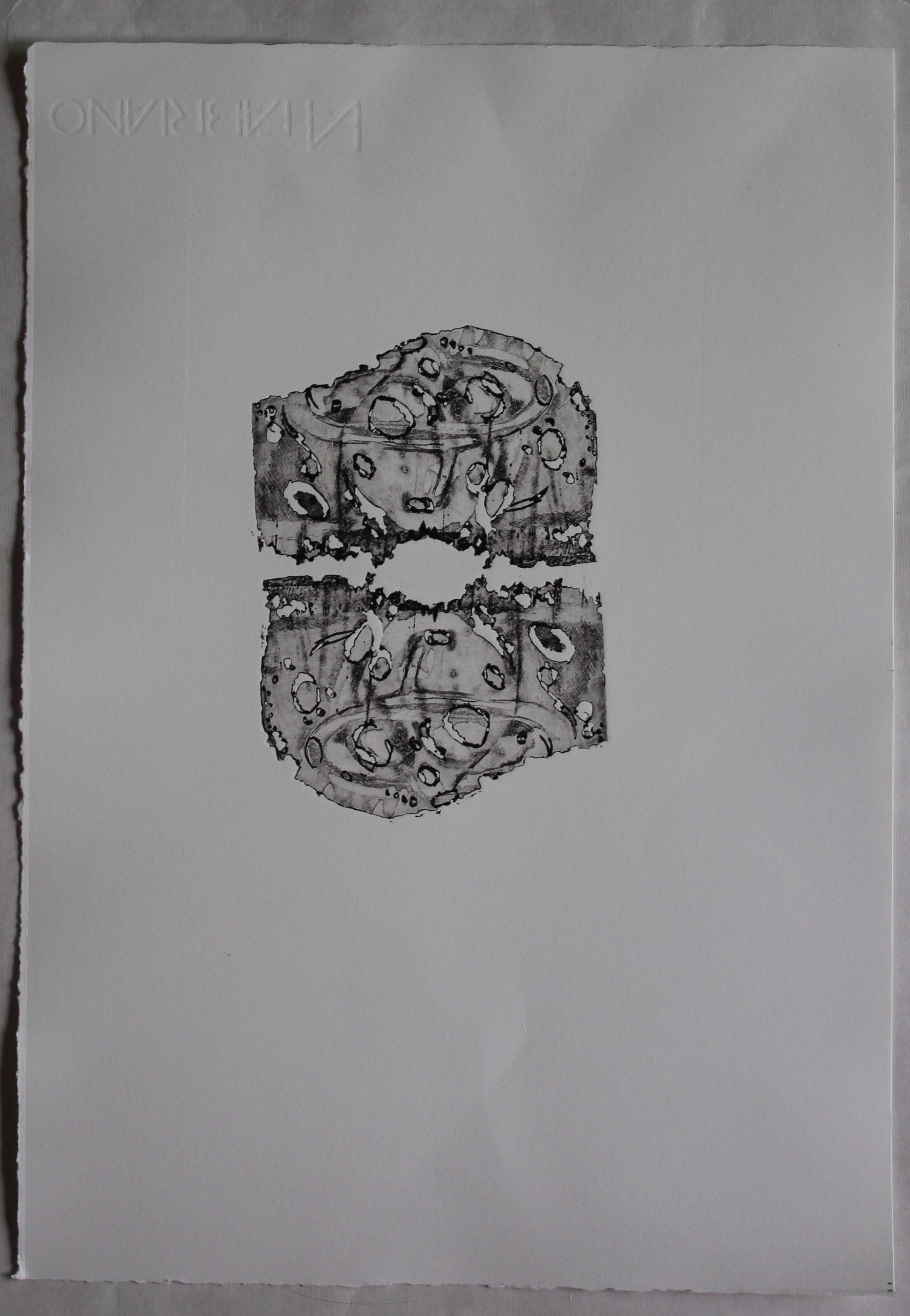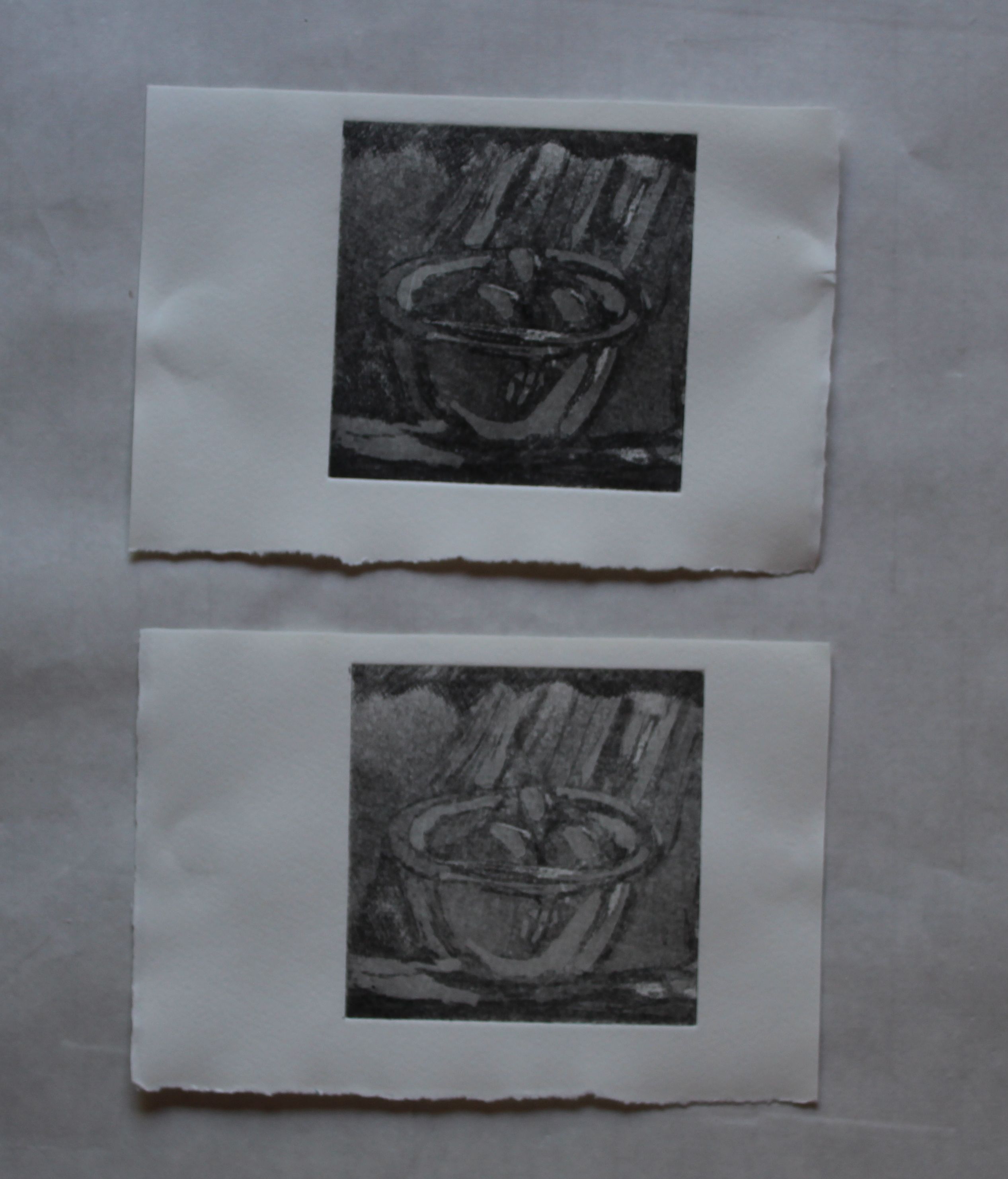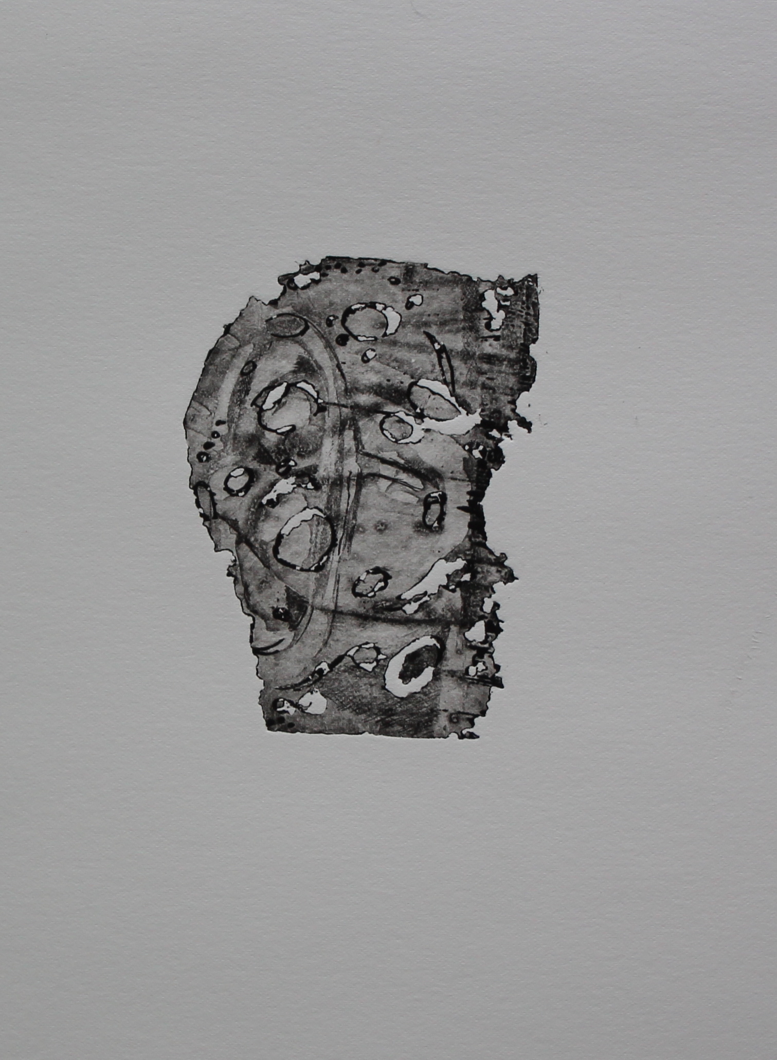 There is still a trace of the original etch, and the curved lines complement the cut holes. The ragged edges, and the marks, suggest to me a brain, but also echo the “moon” images I’ve been working on, with crater-like shapes and shadows, looking ahead to the “Chiaroscuro” assignment. The shape is beautiful, and can be printed in multiples to create new shapes, with a pleasing organic quality, but just a hint of a graphic question mark shape, which is why I’m calling it “the questioning mind”- but beneath what might appear to be a celebration of curiosity, there is also the idea of degradation, of things being eaten away, deterioration. technically, I love the softness of the etched surface against the crispness of the edges, and the way those edges hold the ink.