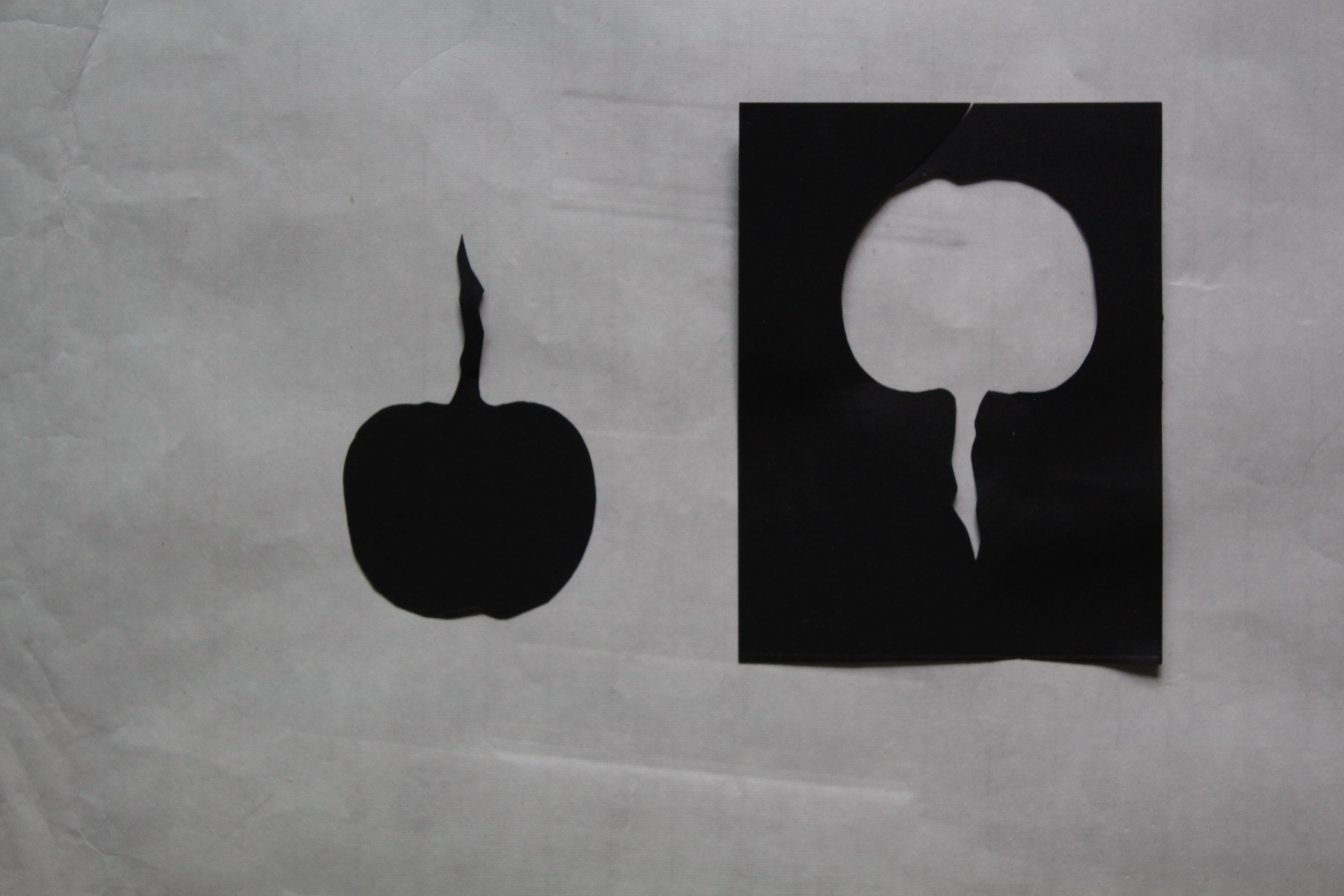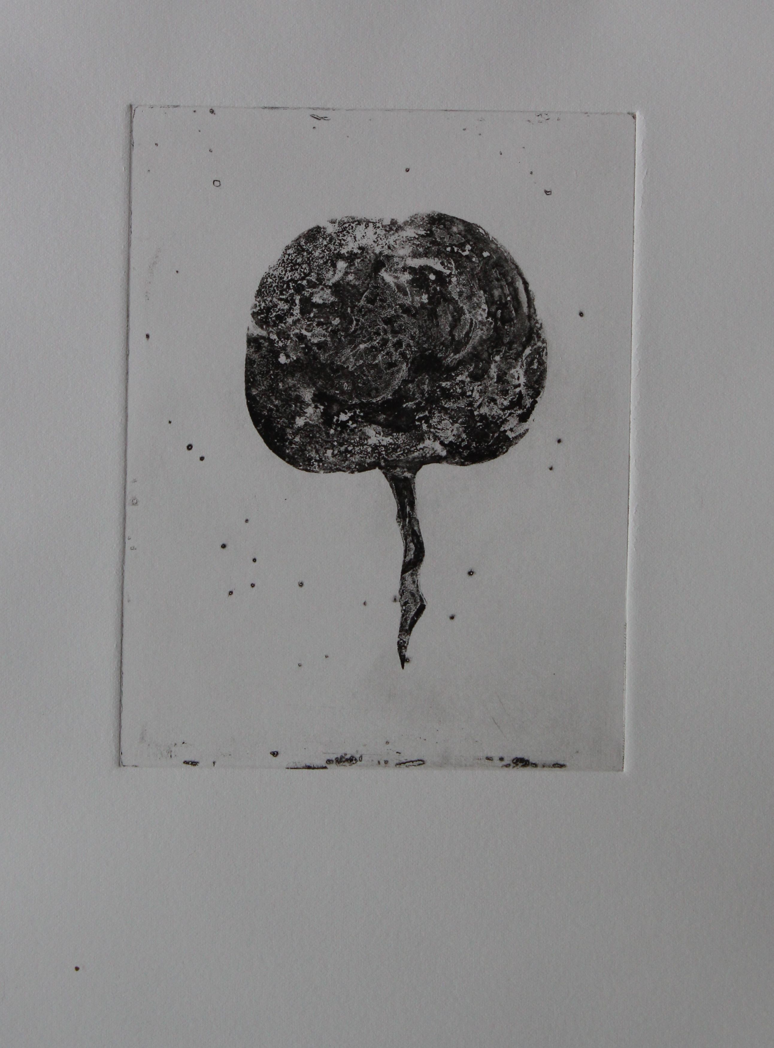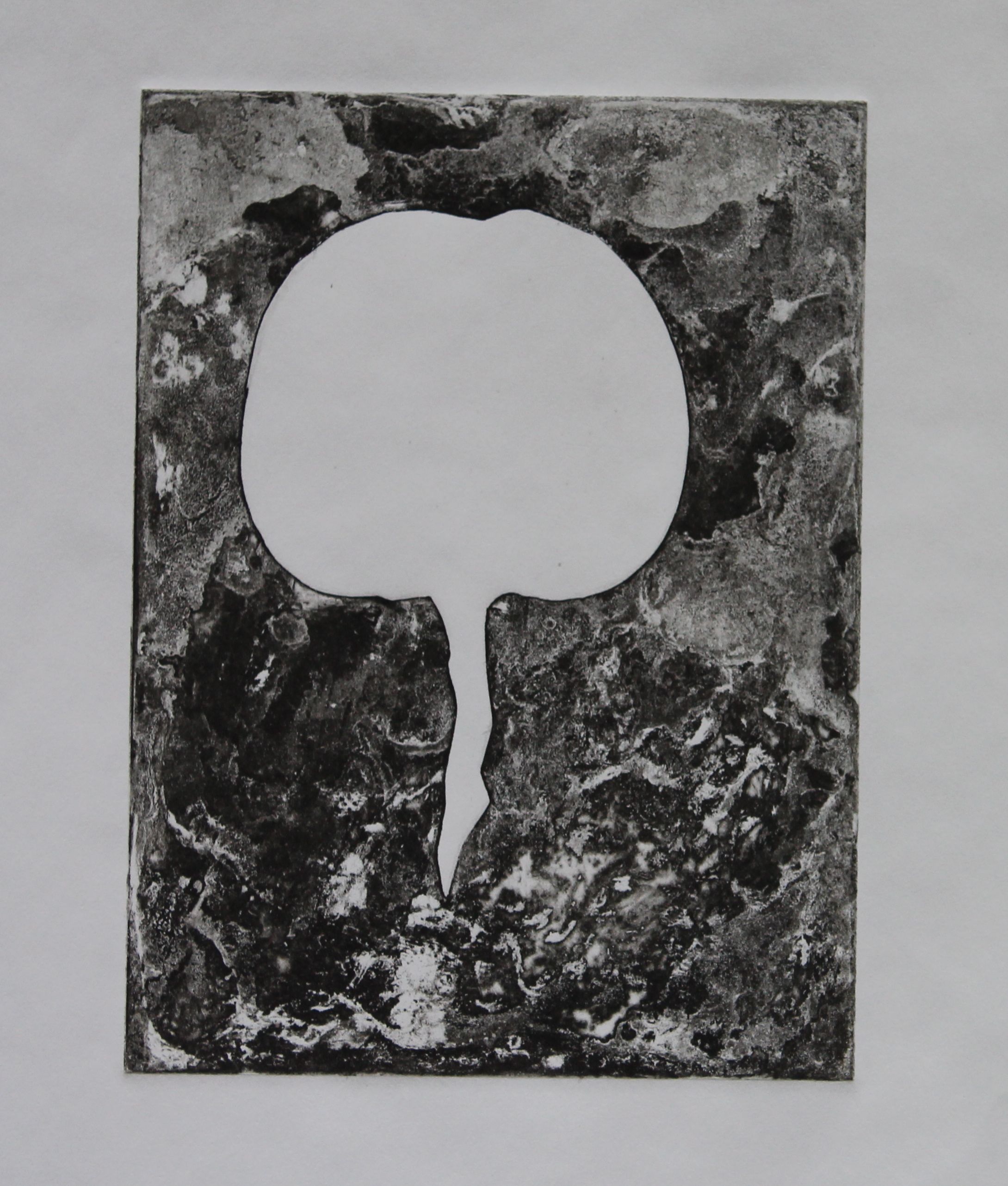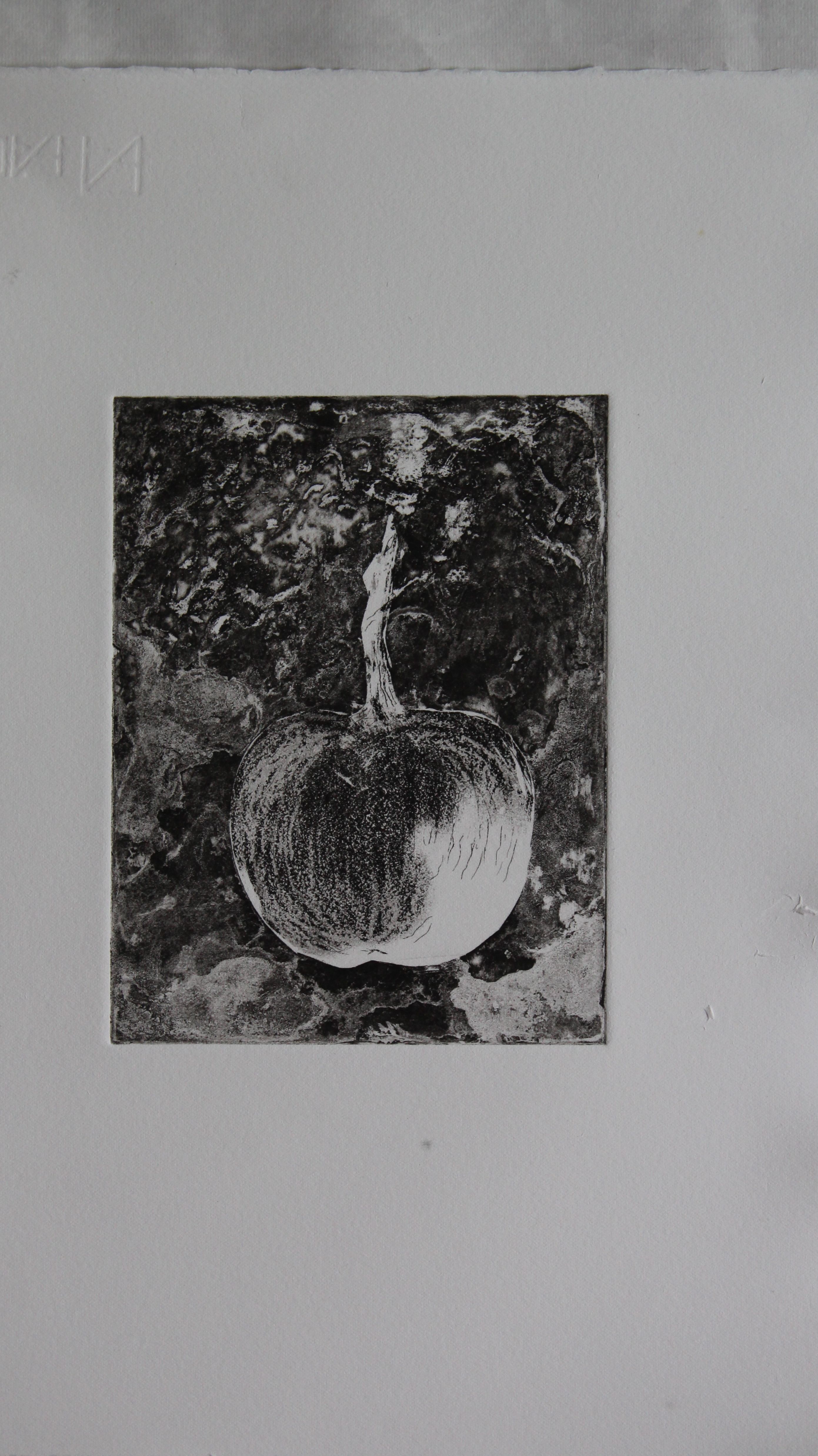 Now back to the other plate. I removed the photopolymer successfully with caustic, and made an aquatint layer with an airbrush and acrylic – concentrating a dense spray on the highlighted part of the shape. The background now had to be stopped out, which I did by painting a layer of acrylic ink- also making a fine line on the apple, to create a thin highlight. The shading was done using a wax crayon- two layers of dark and light grey, and sharp lines engraved with a needle. The stop-out ink was hard to remove from the background though, and I wonder if this could have been done differently.