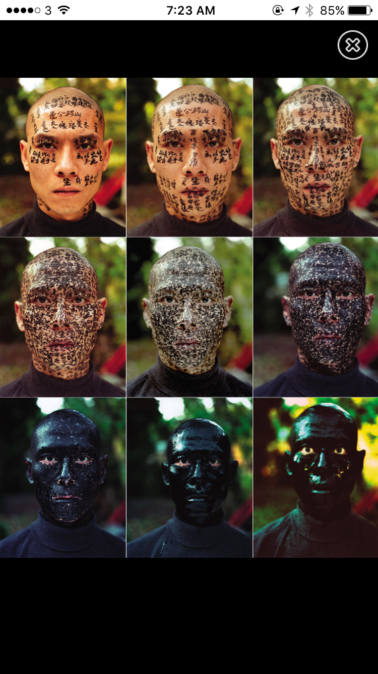This image by Zhang Huan struck me particularly in terms of process, the accumulation of ink eventually covering the face, thus challenging ideas of heredity (clearly referenced in the title of the work “Family Tree”) and identity, in what seems to be a declaration of profound and shocking change taking place. (The racial overtones could be particularly telling in this cultural context.)