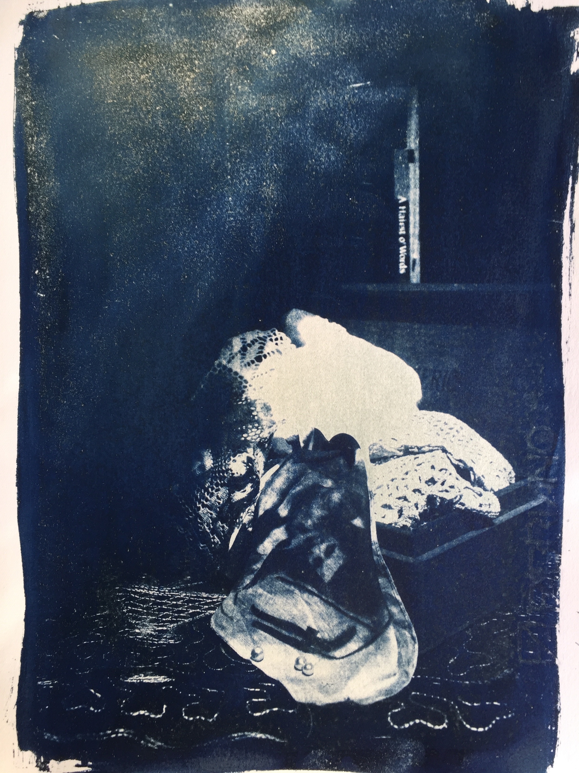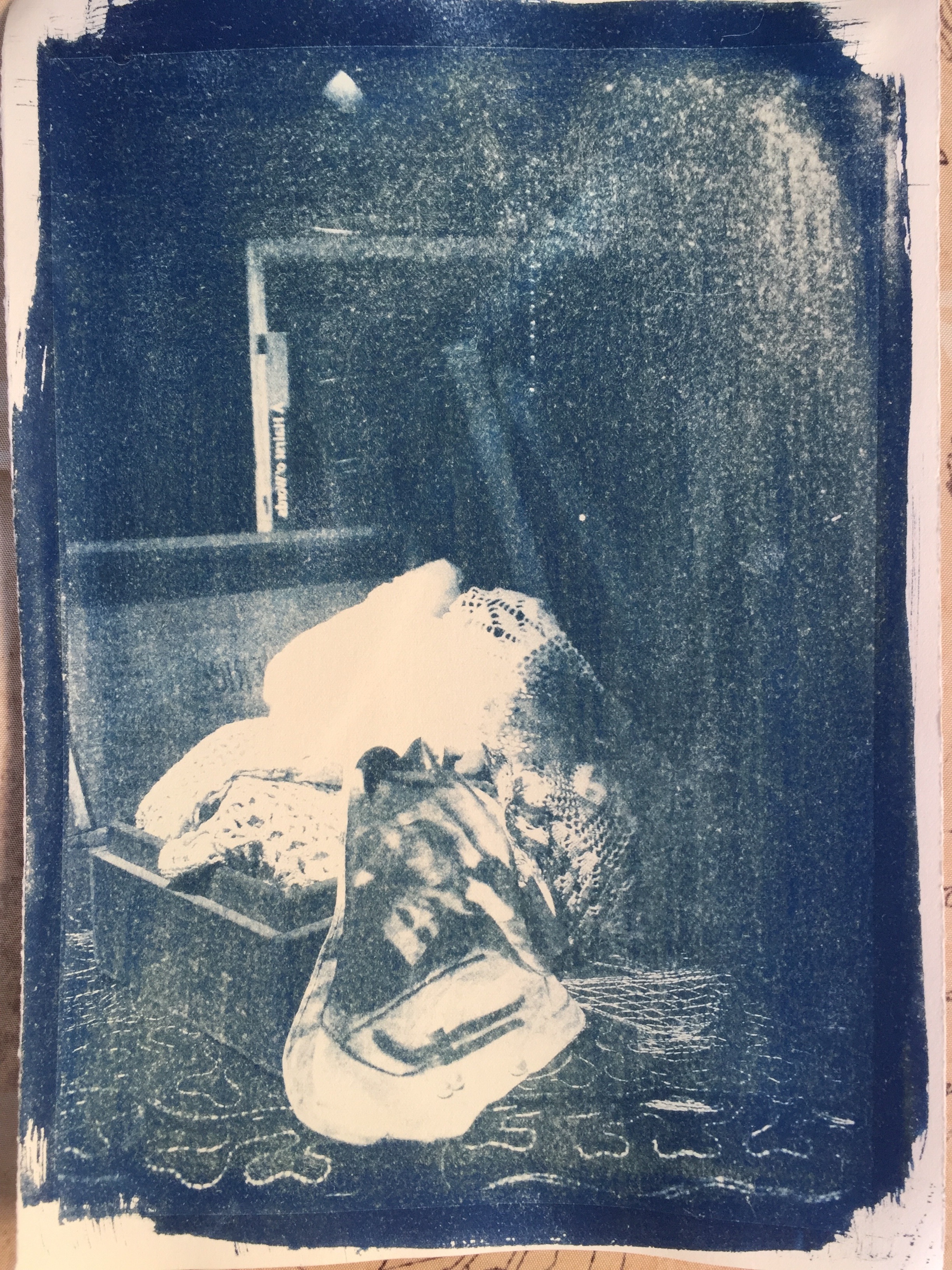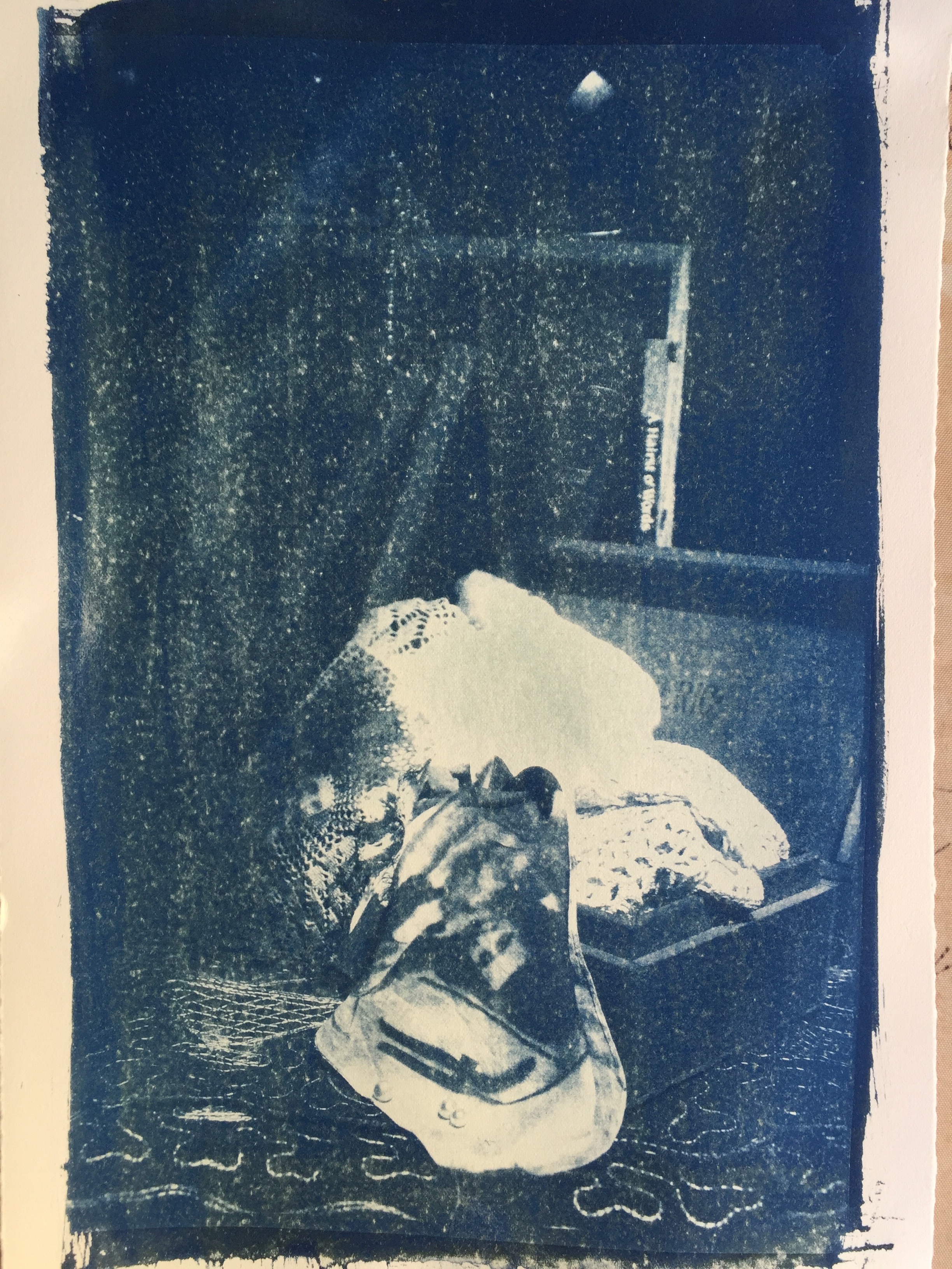 I decided to try putting cyanotype images on other materials- I tried a few items, but they all proved more or less impermeable, but it worked with a handkerchief and a hand crocheted doily. These are old, antique, materials, of significance in themselves, now being stamped with an identity. I arranged these in a still life, trying to arrange the light so as to achieve depth from the chiaroscuro effects. The still life was composed of books from my mother’s collection, and one from mine, TS Eliot, Four Quartets. A handbag, a broken string of pearls from my brother’s wedding, an antique glass vase, a small brass container, a wooden box which she had used to keep my father’s papers in, and a collection of my grandmother’s lace. The effect is of a Victorian photograph, and resonates a feeling of a dusty unvisited room, relics, memorialising as an art form. Without this stamp, this is an ordinary object that is only recognisable to me. By placing an image on it, it becomes clear that this is some kind of object of reverence, stamped with an identity, and evocative of a presence. I’m thinking of Tennyson’s poem, In Memoriam, in which the weight of memory is overpowering, and the stillness of the present is palpable, making it hard to move forward. That makes it become fetishistic, perhaps.