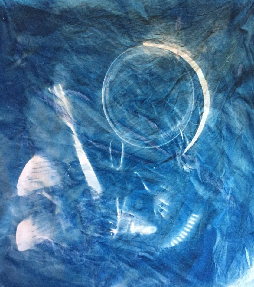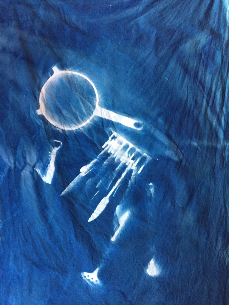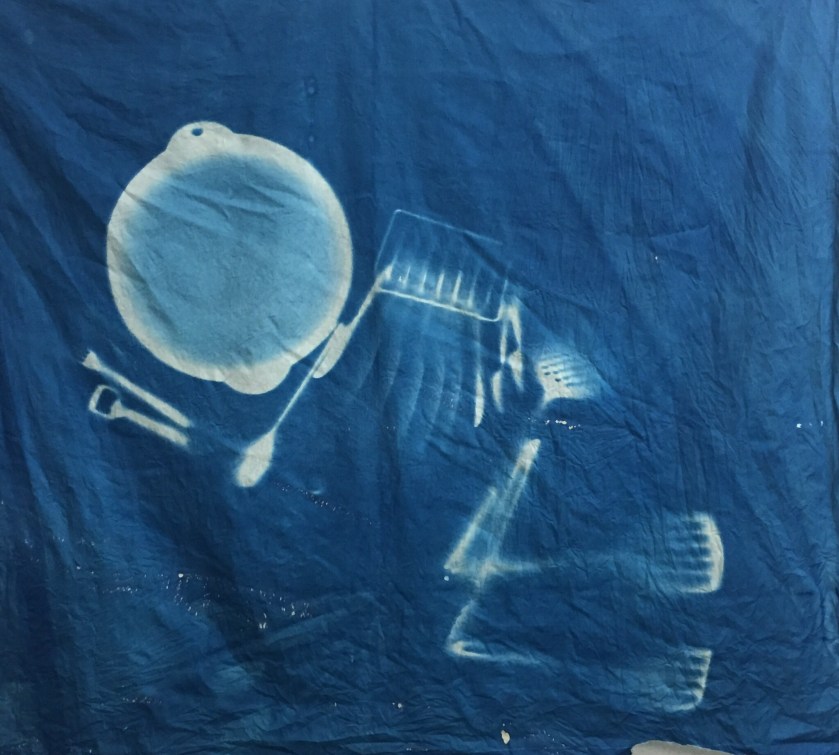 It was important to match the materials and the subject- hence the relationship to domestic objects and crafts, but the process too was important- the idea of imprinting a shape that is exactly the same size and dimensions as the real life body, or tool, creates a visceral connection between the subject and the image, as the subject and the ground have to touch. What is variable and serendipidous is the shadows cast – these can be controlled by the direction of the light, but are also highly dependent on environmental factors such as time of day, weather, location and UV strength. However, I had also noted the process used by Rauschenberg and Weil, and had a UV lamp to use as well- as the direct exposures of my own body would be very hard to arrange outdoors, without exposing the cloth too soon. That method would allow the exposure to be done inside, and the shapes arranged in a darkened room. I also realised that to an extent, double exposures could be arranged, and that errors could be fixed by re-applying cyanotype chemicals and re-exposing.