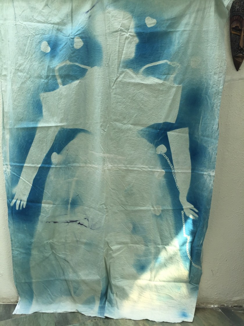This was done indoors, using a UV lamp, which of course I had to get help with. Making something this size meant the lamp had to be moved- this means that shadows are obliterated by the moving lamp, and in the end the image was not at all clear. There were also patches, which I think was to do with my rinsing in vinegar which had been previously used for this, and which still contained dye. The watery effect is not unpleasant, but on the whole this didn’t work. I felt that I should not pursue this method. It was too hard to be lying still giving instructions and unable to check what was happening. I need to involve another model and control the light myself.
