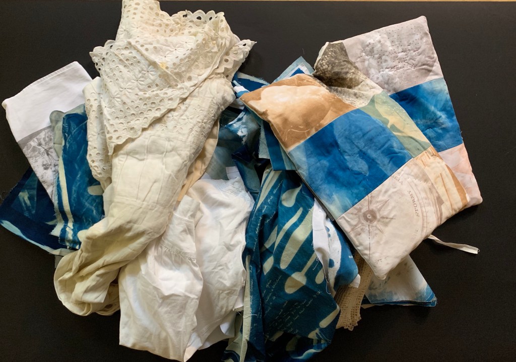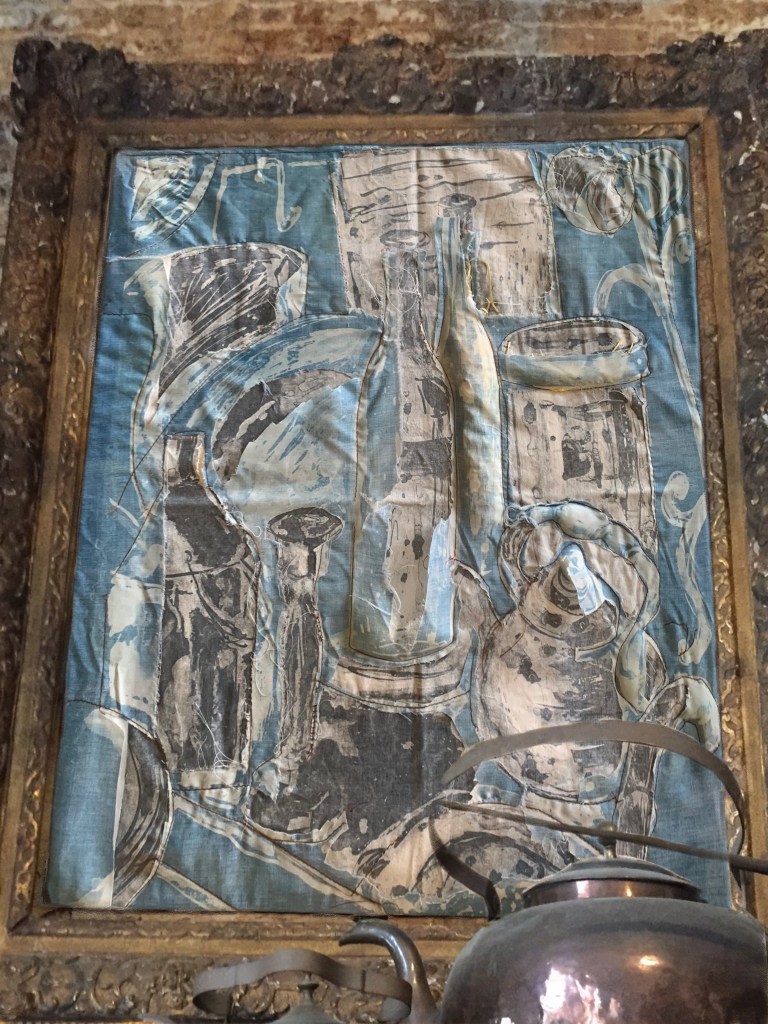 Particularly evocative for me is the Book of Sleep and Dreaming, there’s something about the folding and sound of the fabric that recalls momentos of long dead relatives, separated in boxes by thin tissue paper, it’s comforting and yet speaks of loss. I also like the Poem, Washed Up, on rusted cloth. You don’t actually need to be able to read the poem to take meaning from the piece, it’s symbolic as the remains of a human being expressing themselves in poetry but layered with the marks of time, I’m attracted to the materiality of the torn pillow case and the rusty nail marks, just a personal thing.