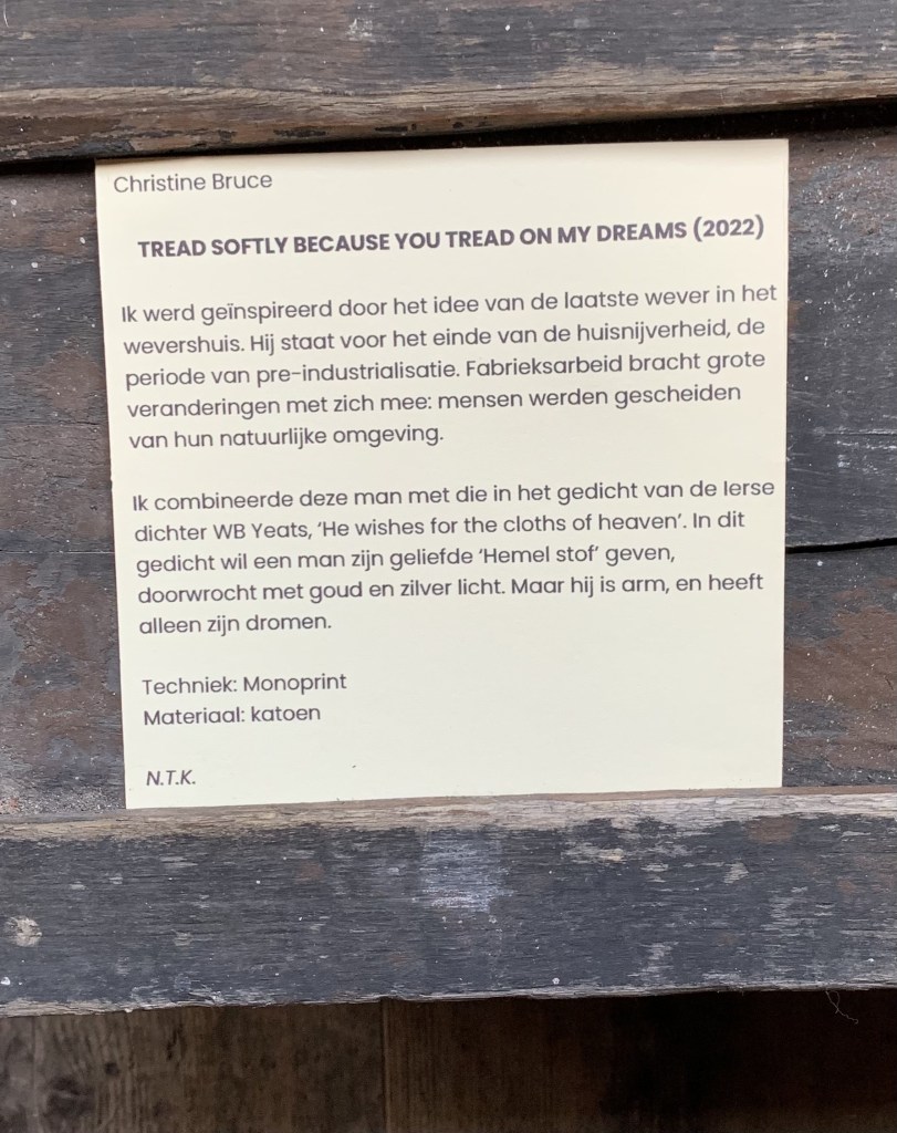Ik werd geïnspireerd door het idee van de laatste wever in het wevershuis. Hij staat voor het einde van de huisnijverheid, de periode van pre-industrialisatie. Fabrieksarbeid bracht grote veranderingen met zich mee: mensen werden gescheiden van hun natuurlijke omgeving.